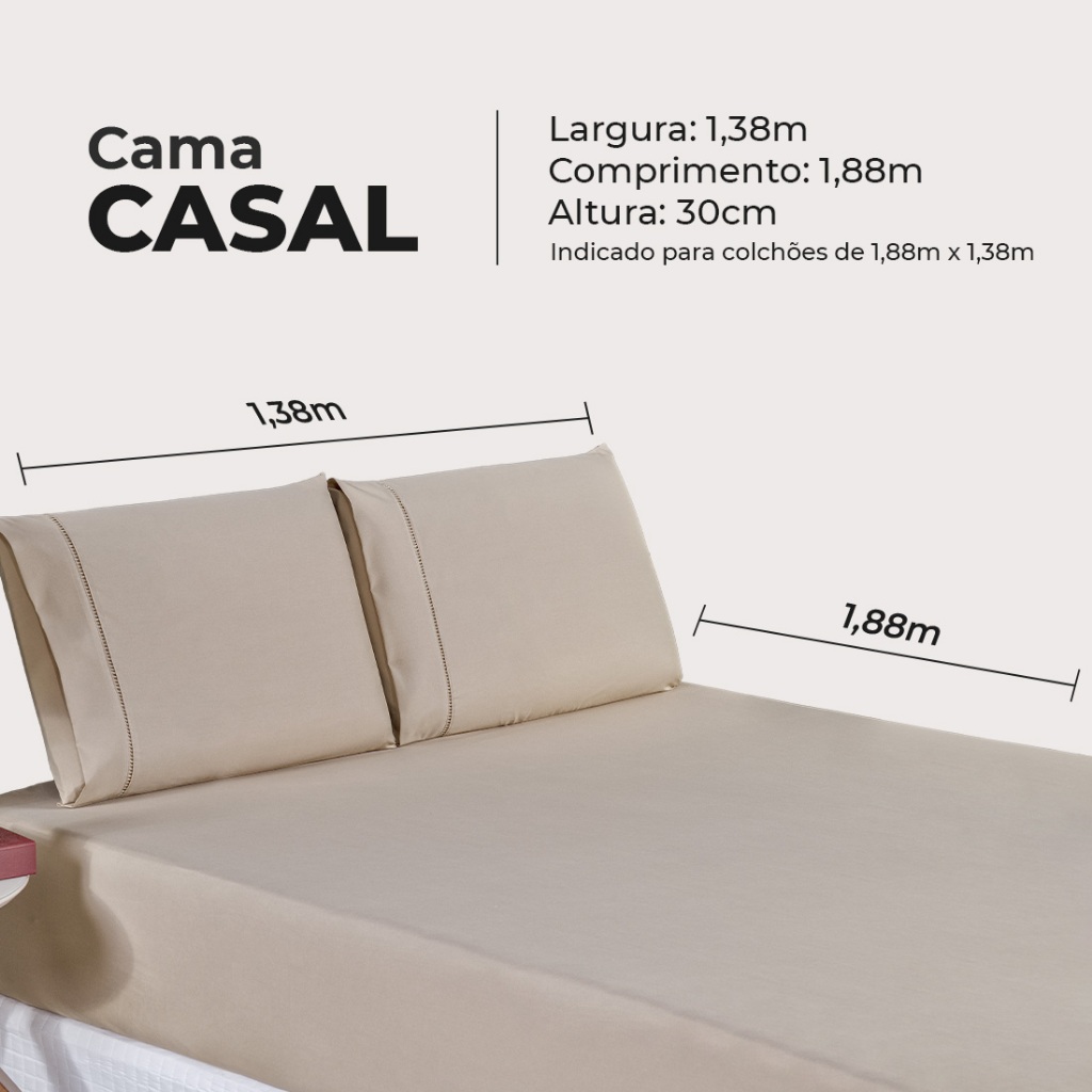 DETALHES DO PRODUTO JOGO DE CAMA LENÇOL COM ELÁSTICO CASAL PADRÃO BOX 03 PEÇAS - 400 FIOS TOQUE EXTRA PREMIUM 100% POLIÉSTER. *Ideal para Cama Casal Box. - Roupa de cama com elástico em toda a volta. - Fronhas com fechamento do tipo envelope, não possuem zíper. - Ideal para Cama Box Casal com 30cm de ALTURA. - Contém toque aveludado, não desbota e nem junta bolinhas. ------------------------------------------------------------ O QUE VAI NA EMBALAGEM *01 Lençol de baixo com elástico em toda volta 1,88m x 1,38m x 30cm altura *02 Fronhas Ponto Palito 70cm x 50cm COMPOSIÇÃO: 100% Poliéster 400 Fios TECIDO: Micropercal 400 Fios Toque Extra Premium 100% Poliéster Tecido com Toque Macio ------------------------------------------------------------ FICHA TÉCNICA Para cama: CASAL Qtde de Peças: 03 Peças Acabamento: Bainha Tecido | Tipo Percal 400 fios de Poliéster Lavagem: Instruções na etiqueta Garantia: 1 Mês | Contra defeito de fabricação ------------------------------------------------------------ COMPROMISSO COM A QUALIDADE Somos os fabricantes deste produto, o que nos permite assegurar a qualidade e a satisfação completa. Com todos os produtos a pronta entrega, garantimos uma experiência de compra excepcional e postagem rápida do seu pedido. Invista no seu sono com qualidade e estilo — Adicione nosso Jogo de Lençol Solteiro Percal ao seu carrinho hoje mesmo!