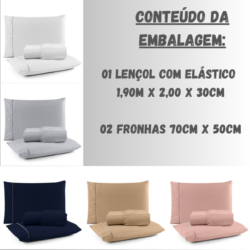 Jogo de Lençol King 3 peças tecido 600 Fios Macio e Aveludado com detalhe nas fronhas em ponto palito de excelente qualidade e com ótimo acabamento. DESCRIÇÃO DO PRODUTO: Jogo de Lençol King CONTÉM 03 PEÇAS 01 Lençol De Baixo CASAL KING com elástico volta toda medindo 1,90x 2,00 x 30 cm 02 Fronhas (70 X 50 Cm) com detalhe em Ponto Palito Composição: Micropercal 600 Fios 100% Poliéster ENVIO IMEDIATO PARA TODO O BRASIL
