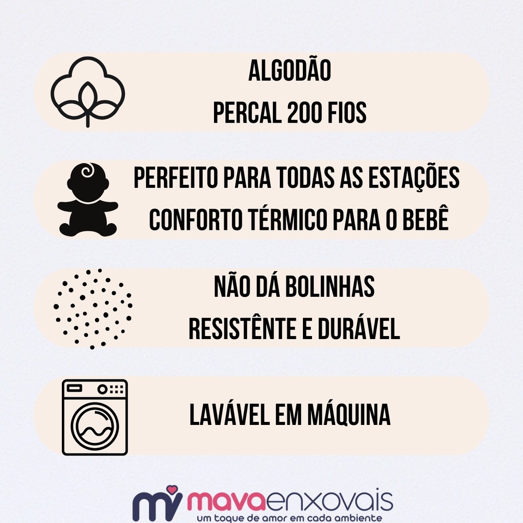 Jogo de Lençol para Berço Algodão percal 200 Fios Micropercal Transforme o soninho do seu bebê com conforto e qualidade!Nosso jogo de lençol para berço é confeccionado em algodão 200 fios, com um toque ultra macio, perfeito para a pele delicada dos pequenos. ✔ Lençol com elástico em toda a volta – encaixe firme e seguro✔ Fronha com fechamento envelope – mais praticidade no dia a dia✔ Serve berço padrão nacional e americano✔ Tecido respirável, resistente e de alto padrão Ideal para completar o enxoval com sofisticação, carinho e cuidado. Seu bebê merece esse aconchego! CONTÉM NA EMBALAGEM: 1 Lençol de Elástico 1 Fronha MEDIDAS: Lençol: 1,30m x 70cm x até 15cm Fronha: 32cm x 28cm COMPOSIÇÃO: Percal 200 Fios 100% Algodão Quer comprar mais de uma cor em uma única compra? É simples! Basta selecionar a cor desejada e ao invés de finalizar a compra, você inclui ao seu carrinho! Assim você poderá voltar ao anúncio para escolher outra cor e adicionar ao seu carrinho novamente! Para finalizar sua compra basta ir ao seu carrinho de compras e finalizar! **TONALIDADE DO PRODUTO PODE VARIAR EM RELAÇÃO AS FOTOS** Uma empresa estabelecida no mercado há anos, especializada na venda de produtos de cama, mesa, banho e decoração. Durante esse tempo, conquistou a confiança dos clientes graças à sua qualidade excepcional e variedade de produtos. Com um compromisso constante com a excelência, a Mava Enxovais continua a ser uma escolha preferencial para quem busca conforto e estilo em sua casa. Dúvidas? Entre em contato conosco! Aguardamos sua Compra!