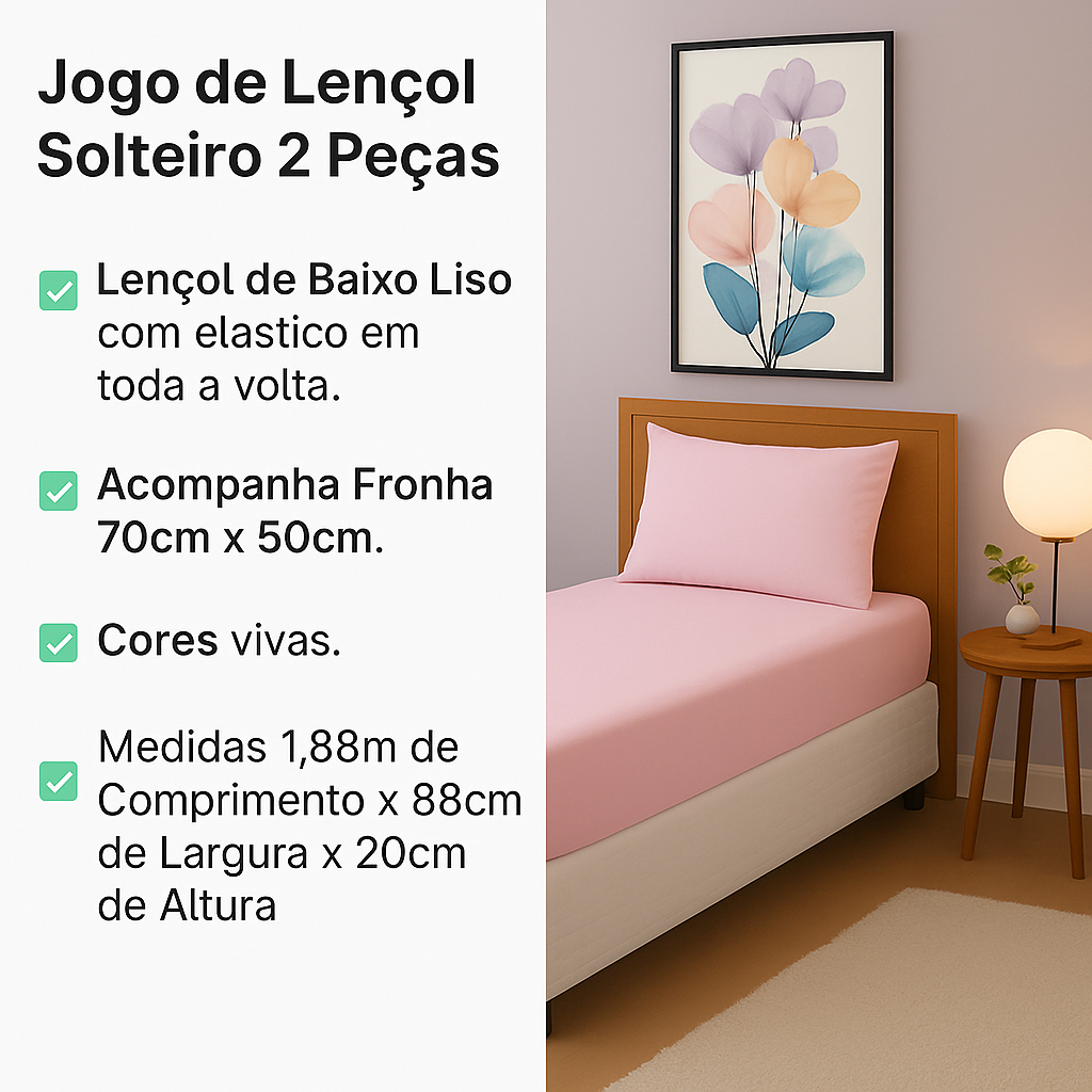 Jogo De Lençol Solteiro 2 Peças Liso com Elástico Promoção - Praticidade para o Dia a Dia Renove sua cama com o Lençol Solteiro 2 Peças em Microfibra, perfeito para quem busca conforto e praticidade. Composto por 1 lençol com elástico, que se ajusta perfeitamente ao colchão, e 1 fronha, o jogo é ideal para uso diário e combina com diversos estilos de decoração. Além disso, a microfibra é fácil de lavar, seca rapidamente e não amassa com facilidade, garantindo mais praticidade na sua rotina. - 02 Peças - TAMANHO: Solteiro - Lençol Com Elástico Em Toda Extremidade Para Melhor Fixação No Colchão - Toque Macio - Dispensa Passar Contém: 1 Lençol com elástico 88cm de largura x 188cm de comprimento x 20cm de altura 1 Fronha 50cm x 70cm ----------TOTALIZANDO ASSIM 2 PEÇAS---------- Composição: 100% Poliéster (microfibra) Destaques: Toque macio e agradável Ajuste perfeito ao colchão Secagem rápida e fácil de passar Ideal para o uso diário Para preservar a qualidade durabilidade do seu lençol de microfibra, siga as orientações abaixo: ✅ Lave à máquina em ciclo suave, com água fria ou morna (até 40 °C); ✅ Use sabão neutro e evite o excesso de produto; ✅ Separe por cores: lave peças claras e escuras separadamente para evitar manchas; ✅ Evite o uso de alvejantes com cloro, pois podem danificar as fibras; ✅ Não use amaciante em excesso, pois pode reduzir a absorção e o toque macio natural da microfibra; ✅ Secagem em varal à sombra é ideal, mas também pode ser levado à secadora em temperatura baixa; ✅ Não passe com ferro quente – normalmente, não há necessidade, pois a microfibra não amassa com facilidade. *******************ENVIO IMEDIATO******************** As fotos são meramente ilustrativas, as cores podem variar de acordo com cada monitor. Para qualquer dúvida, entre em contato conosco pelo campo de perguntas. Será um prazer atendê-lo (a) ! M&E Enxovais agradece sua visita!!! Boas Compras! DEUS ABENÇOE.