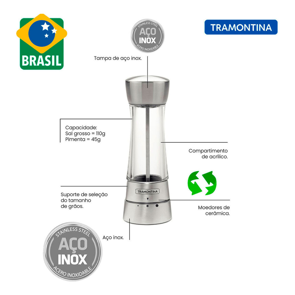 | Jogo De Moedor De Sal E Pimenta Tramontina Aço Inox 2 Peças | R$ 225,44 | 5% | 5.0/5 | 9 |