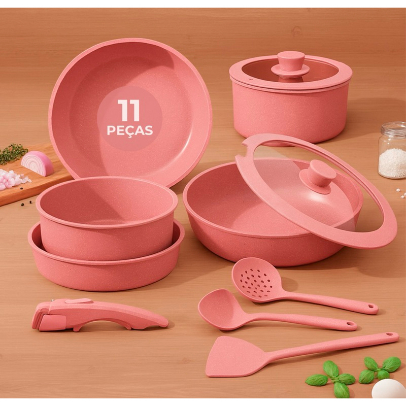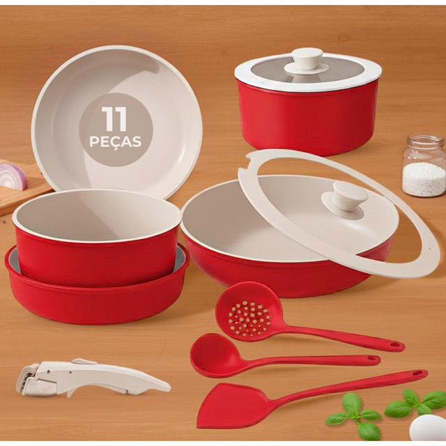 O Jogo de Panelas Antiaderente 11 Peças com Cabo Removível une praticidade, elegância e tecnologia para transformar sua rotina na cozinha. Com revestimento soft-touch, toque aveludado e acabamento sofisticado, as panelas oferecem uma experiência premium, garantindo preparo eficiente e armazenamento inteligente. Seu design empilhável e o cabo removível otimizam o espaço nos armários, permitindo mais organização e praticidade no dia a dia. Além disso, as panelas possuem aquecimento rápido e uniforme, ideal para preparar alimentos de maneira eficiente e saudável. As tampas de vidro com saída de vapor ajudam no controle do cozimento, enquanto o revestimento antiaderente de alta qualidade evita que os alimentos grudem e facilita a limpeza. O conjunto é compatível com fogões a gás, elétricos, vitrocerâmicos e por indução, garantindo versatilidade total. CARACTERÍSTICAS - Revestimento soft-touch de toque macio e fácil de limpar; - Compatível com fogões a gás, elétrico, vitrocerâmico e indução; - Aquecimento rápido e uniforme; - Design empilhável com cabo removível ~ Voltar ao topo economizar espaço; - Tampa de vidro com saída de vapor; - Revestimento antiaderente ultra resistente; - Alça com sistema de encaixe seguro e ergonômico. CUIDADOS E INSTRUÇÕES DE USO: - Lave com esponja macia e detergente neutro antes do primeiro uso; - Aplique uma fina camada de óleo na superfície antiaderente para melhor desempenho; - Evite o uso de utensílios metálicos para preservar o revestimento; Adequado para lava-louças, mas o uso frequente pode causar manchas na base sem comprometer a durabilidade; - Evite choques térmicos para prolongar a vida útil. BENEFÍCIOS: - Ideal para cozinhas modernas e compactas - Revestimento que impede que os alimentos grudem - Facilidade na limpeza e no armazenamento - Segurança no manuseio com cabo removível e alças firmes - Estilo sofisticado e funcionalidade em cada detalhe COMPOSIÇÃO DO KIT (11 PEÇAS): 1 Panela 20cm 1 Caçarola de 20 cm 1 Frigideira de 20 cm 1 Frigideira de 26 cm 1 Frigideira alta de 26 cm 1 Alça desmontável 1 Tampa de 20 cm 1 Tampa de 26 cm 3 Colheres de polipropileno.