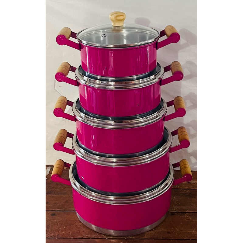 Jogo de Panela 5 Peças Rosa Bebê Alumínio Leve com Tampas de Vidro Pegador em Madeira