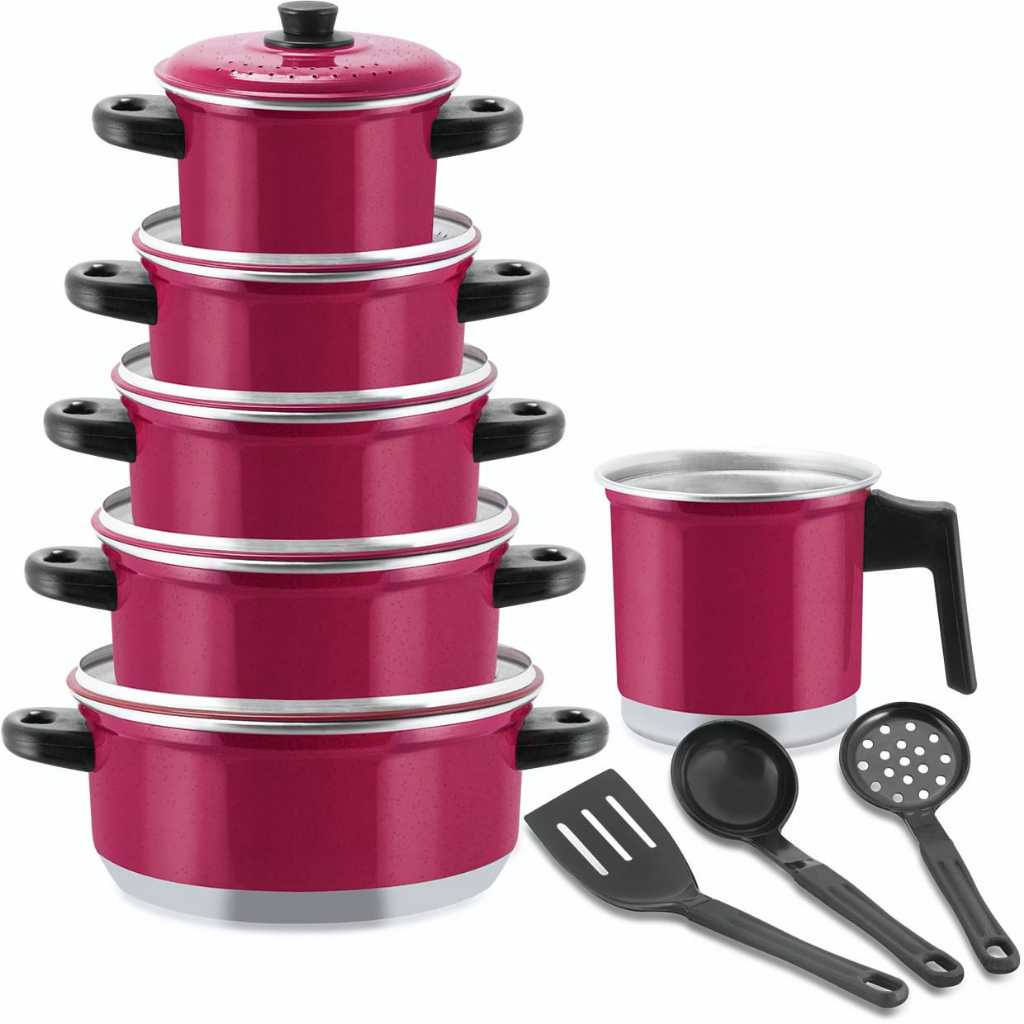 *Compatível com todos os tipos de fogão, menos por indução. CARACTERÍSTICAS: - Composta por 4 caçarolas; - 1 Caldeirão - 1 Caneco(leiteira) - Acabamento em pintura eletrostática ESPECIFICAÇÕES: - Material: corpo em alumínio, alças e pomel em baquelite DIMENSÕES: 1 Caldeirao14 cm diâmetro x 8 cm altura 1 Panela 16 cm diâmetro x 6,5 cm altura 1 Panela 18 cm diâmetro x 7,5 cm altura 1 Panela 20 cm diâmetro x 8 cm altura 1 Panela 22 cm diâmetro x 9,5 cm altura 3 Utensílio de Nylon 1 Caneco(leiteira) 12 cm de diâmetro Informações técnicas Revestimento: - Interno Alumínio - Externo Pintura Eletrostática Material: - Alumínio - Baquelite com revestimento de silicone Tampa: - Material: Alumínio Instruções de lavagem - Lavar manualmente com água e sabão - Não usar esponjas abrasivas, nem utensílios de metais. Recomendações de uso - Evite quedas fortes - Feito para os amantes da cozinha gourmet OBS: MEDIDAS APROXIMADAMENTE Garantia do vendedor: 3 meses
