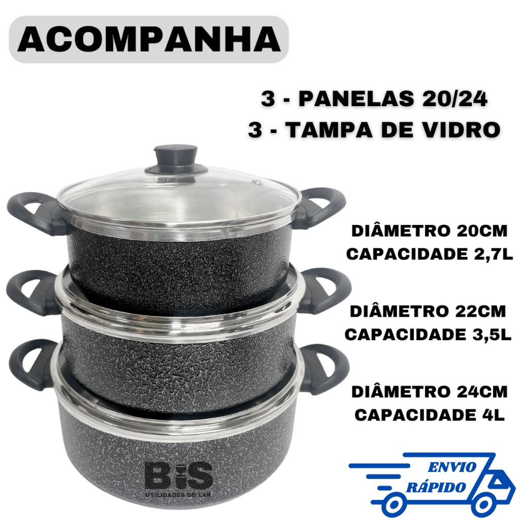 O Jogo de Panelas Caçarola Conjunto Kit com 3 Peças é a escolha perfeita para quem busca praticidade e eficiência na cozinha. O conjunto inclui uma variedade de panelas e tamanhos para atender às necessidades da sua cozinha, incluindo tampas de vidro com saída a vapor para cozimento lento e conservação de temperatura. Material 100% em alumínio, melhor custo benefício do mercado. Envio Imediato após confirmação de pagamento. Jogo com 3 peças 16/20: Número 16 : 8 cm de altura x 16 cm diâmetro x 26 cm largura com os cabos x peso aproximado 430 g x capacidade 1,3 litros Número 18 : 8,5 cm de altura x 18 diâmetro x 28 cm largura com os cabos x peso aproximado 500 g x capacidade 1,8 litros Número 20 : 9 cm de altura x 20 diâmetro x 30 cm largura com os cabos x peso aproximado 600 g x capacidade 2,4 litros Jogo com 3 peças 20/24: Número 20 : 9 cm de altura x 20 diâmetro x 30 cm largura com os cabos x peso aproximado 600 g x capacidade 2,4 litros Número 22 : 9 cm de altura x 22 diâmetro x 32 cm largura com os cabos x peso aproximado 710 g x capacidade 3,0 Litros Número 24 : 9,5 cm de altura x 24 cm diâmetro x 34 cm largura com os cabos x peso aproximado 840 g x capacidade 3,8 Litros Cor: Preto Craqueado Acompanha 3 Panelas 3 Tampa de Vidro. **Fotos Reais do produto**