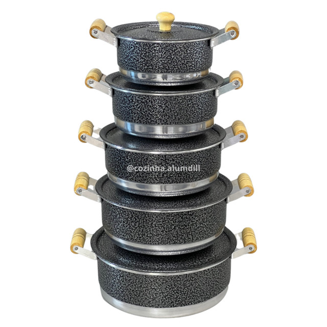 Jogo de Panela Conjunto Kit Cacarola Pop com 5 unidades Alça de Madeira com Tampa Preto Craqueado
