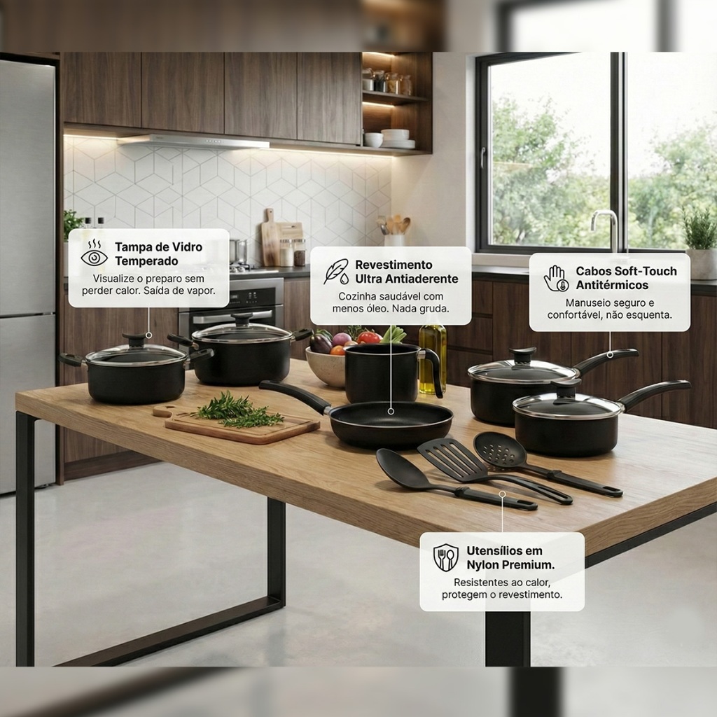 Jogo de Panelas 09 Peças D'Itália Antiaderente c/ Tampa de Vidro + Utensílios