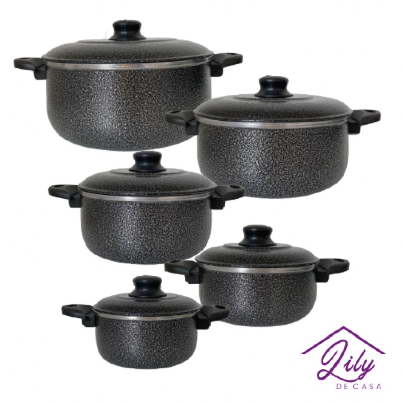 Jogo de Panelas 5 pçs em Alumínio nas cores Rosa Bebê , Rubi, Polido e Preto.