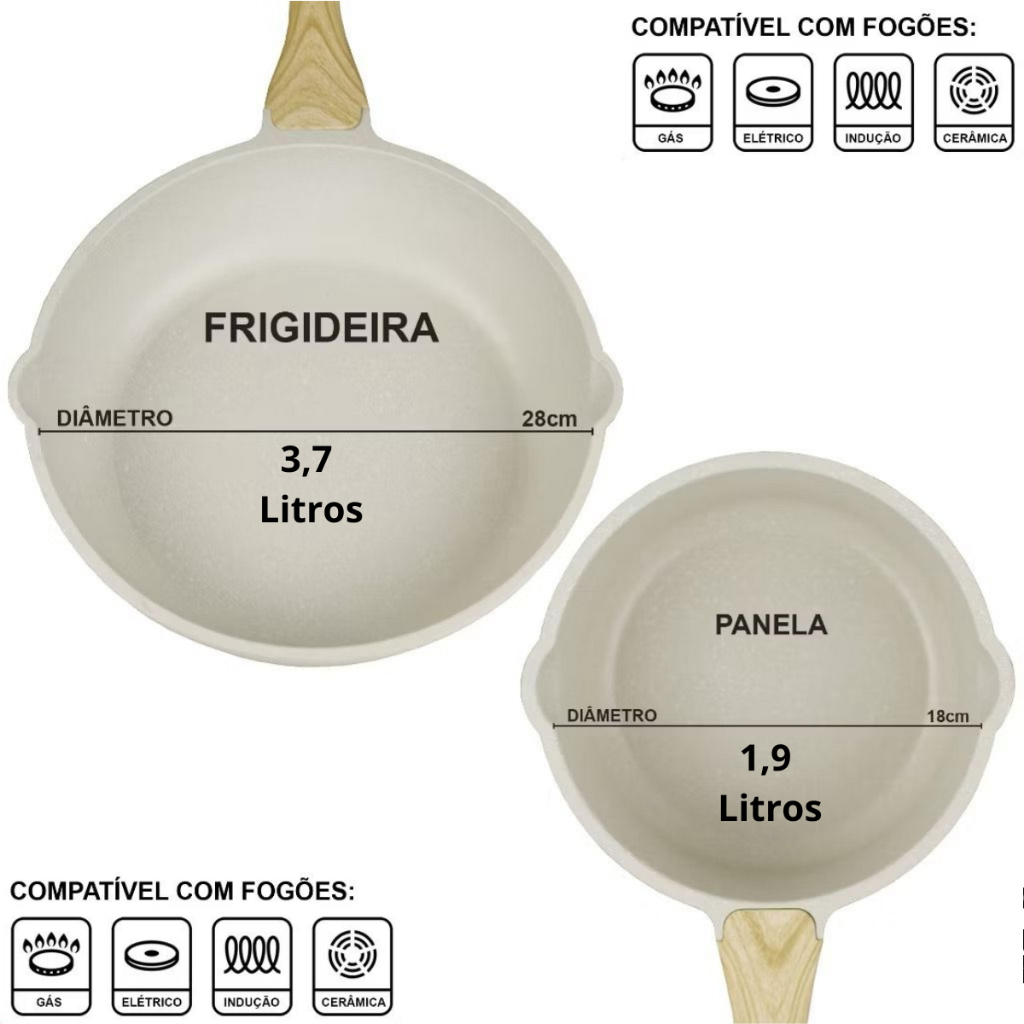 !!ENVIO IMEDIATO!! ACEITA EM TODOS OS TIPOS DE FOGÔES!!! Conjunto de panelas de indução com revestimento cerâmico com 5 peças. Projetadas para eficiência e durabilidade, são ideais para cozinhar de maneira saudável e fácil de limpar. Compatível com todos os tipos de fogões, garantem aquecimento rápido e uniforme, proporcionando uma experiência culinária gourmet em casa. O Conjunto de Panelas 5 peças possui 2,5mm de espessura, o que melhora o preparo de seus alimentos, pois a temperatura é dissipada de maneira uniforme e favorece o cozimento, evitando que sua comida queime facilmente. O kit de panelas é indicado para todos fogões, sejam eles a gás, indução, vitro-cerâmico ou elétrico. É composto por 3 caçarolas, 1 panela com cabo e 1 frigideira, todos em alumínio com revestimento nano cerâmico granite. As panelas não grudam, são mais fáceis de limpar e mais saudáveis, pois necessitam de menos óleo para o cozimento e são livres de metais pesados. As peças do conjunto possuem cabos e alças com acabamento Soft-Touch com efeito amadeirado, que dão um toque macio e não esquentam, evitando acidentes. As tampas também possuem efeito amadeirado e suas bordas são em silicone removível, oque facilita sua lavagem e limpeza, são feitas de vidro temperado com saídas para vapor em inox, trazendo um design inovador, ideais para você que gosta de sofisticação e elegância em sua cozinha. Fundo de Indução com Camada Dupla: Proporciona aquecimento rápido e uniforme, ideal para qualquer tipo de fogão, especialmente os de indução. Conforto no Manuseio: Os cabos e alças em silicone oferecem uma pegada segura e confortável, tornando o uso ainda mais prático. Fácil Limpeza: As panelas são compatíveis com lava-louças, garantindo uma limpeza rápida e sem complicações. Nosso Jogo de Panelas é completo e tornará o preparo de suas refeições muito mais prazeroso! Detalhes: Com tampa de Vidro e bordas em silicone removível; Conjunto completo; Revestido em Cerâmico Cabos Revestidos efeito amadeirado Antiaderente Panelas de Indução Espessura 2,5mm Dimensões do Produto: Dimensões da Caçarola P (D x A): 20x9,5cm Dimensões da Caçarola M (D x A): 24x11cm Dimensões da Caçarola G (D x A): 28x12,5cm Dimensões da Frigideira (D x A): 28x7,5cm Dimensões da Panela (D x A): 18x9cm Conteúdo na Embalagem 5 Peças: 3 Caçarola 1 Panela 1 Frigideira 5 Tampas de Vidro ATENÇÃO AOS MODELOS 5 PEÇAS (10PÇS COM AS TAMPAS) O produto e as cores podem variar do apresentado nas fotos da embalagem. Imagens meramente ilustrativas. NÃO NOS RESPONSABILIZAMOS POR DANOS CAUSADOS DURANTE A MONTAGEM DO PRODUTO MEDIDAS DOS TALHERES DE SILICONE: - 01 Colher Rasa (31,5 cm X 6,7 cm) - 01 Espátula Pão Duro (31,5 cm X 6 cm) - 01 Colher Vazada (31,5 cm X 7 cm) - 01 Concha (31,5 cm X 7,8 cm) - 01 Pegador De Macarrão (31,5 cm X 6 cm) - 01 Espátula Reta (31,5 cm X 8 cm) - 01 Espátula Vazada (31,5 cm X 8 cm) - 01 Colher De Arroz Tradicional (31,5 cm X 7 cm) - 01 Pincel Para Manteiga (27 cm X 3,7 cm) - 01 Fuê Para Massas e Ovos (24,5 cm X 7 cm) - 01 Pinça Com Mola e Trava (27 cm X 3,7 cm) - 01 Copo Decorado Para Guardar Utensílios (15 cm X 12 cm)