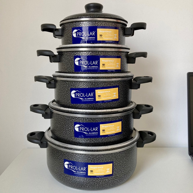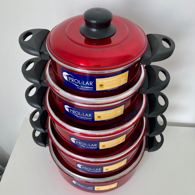 Jogo de Panelas 5 Peças em Alumínio de Excelente Qualidade Confira os principais diferenciais: Espessura: 1,5mm Asas e Pomel em Baquelite: *Ergonômicas *Isolantes que não esquentam *Proporcionando um manuseio muito mais seguro e confortável. Interior Alumínio com exterior em Preto Craqueado, Vermelho Rubi e Alumínio Polido. Marca: PROL-LAR CONTEÚDO E ESPECIFICAÇÕES TÉCNICAS: Peso: 1,5 kg - GARANTIA DO PRODUTO: Produto 100% original, direto de fábrica. Garantia de 90 dias contra defeitos de fabricação. - FABRICANTE: A Alumínio Prol-lar pauta sua política de Qualidade focada em fabricar e disponibilizar no mercado panelas e derivados, que atendam aos requisitos regulamentares aplicáveis, assim como satisfação de seus clientes, buscando sempre oferecer panelas seguras e com qualidade, através da melhoria contínua do seu Sistema de Gestão de Qualidade. Para deixar sua cozinha mais moderna e estilosa a Prol-lar traz tradição e beleza em alumínio colorido. Feitas com material de alta qualidade elas são perfeita para você que procura a combinação de estilo e praticidade, ideal para todo tipo de preparo. Os produtos Prol-lar, além da beleza e qualidade, também possuem diversas tecnologias que deixam seu dia a dia mais prático e seguro. As peças possuem certificação da INMETRO. ***ENVIO IMEDIATO APÓS A CONFIRMAÇÃO DO PAGAMENTO***