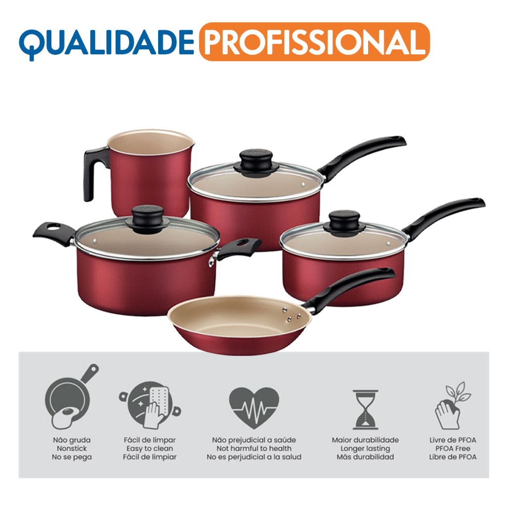DETALHES DO PRODUTO: Com o jogo de panelas Tramontina Turim em alumínio com revestimento interno e externo em antiaderente Starflon Max vermelho 5 peças você vai ter a melhor opção para preparar suas receitas com praticidade e qualidade. Desenvolvidas para uso diário, as peças são produzidas em alumínio com revestimento interno e externo em antiaderente Starflon Max, características que proporcionam um cozimento rápido e uniforme dos alimentos, evitam que eles grudem na superfície, as tornam fácil de limpar e não prejudiciais a sua saúde. Os cabos e alças são em baquelite e os pegadores das tampa em nylon, materiais que não aquecem e proporcionam um manuseio muito mais confortável e seguro. Um jogo durável, que pode ser lavado na máquina de lavar louças e que acompanha tampas de vidro temperado com bordas de aço inox, que auxiliam e facilitam o preparo das receitas! INFORMAÇÕES TÉCNICAS: - Caçarola, panelas e frigideira com 1,2 mm de espessura e fervedor com 1,4 mm, espessuras que proporcionam cozimento rápido e uniforme. - Revestimento interno e externo de antiaderente Starflon Max que não gruda, é fácil de limpar, mais durável e não é prejudicial à saúde, pois é livre de - PFOA. - Tampas de vidro temperado com bordas de aço inox. - Cabos, alças de baquelite antitérmico e pegadores de nylon que oferecem segurança durante o manuseio. - Pode ser utilizada nos fogões: gás, elétrico e vitrocerâmico resistência elétrica. - Podem ir à máquina de lavar louças facilitando seu dia a dia. RECOMENDAÇÃO DE USO: Antes do primeiro uso, lave com esponja macia, sabão neutro ou detergente líquido. Depois de secar, unte a área interna com óleo ou gordura e leve ao fogo por um ou dois minutos. Deixe esfriar e lave novamente. Seu utensílio Starflon está pronto para uso com ou sem gordura, sempre em fogo baixo ou médio (nunca superior a 260ºC). Para mexer os alimentos use somente utensílios de silicone, nylon ou madeira. Limpeza: Evite a imersão do utensílio quente em água fria. Nunca utilize produtos abrasivos na lavagem. Se deixar queimar alimentos, umedeça a área e reserve até que possa remover os resíduos grudados com esponja e sabão. A capacidade volumétrica máxima para cozimento é de 3/4 da capacidade total da peça. Posicione os cabos dos utensílios voltados ao centro do fogão. Em fogões com grade, centralize as peças sobre a chama ou fonte de calor e alinhe os cabos com a grade. Utensílios quentes devem estar fora do alcance das crianças. Para descarte dos produtos e embalagem siga as orientações de reciclagem vigentes. MATERIAL: - Alumínio com Tampa de Vidro MEDIDAS: Frigideira Diâmetro: 20 cm Capacidade: 0,8 L Fervedor Diâmetro: 12 cm Capacidade: 1,1 L Panela Diâmetro: 18 cm Capacidade: 2 L Frigideira Diâmetro: 20 cm Capacidade: 0,8 L Panela Diâmetro: 16 cm Capacidade: 1,4 L ITENS INCLUSOS: 01 Frigideira Tramontina Turim Antiaderente Starflon Max 20 cm 0,8 L 01 Fervedor Tramontina Turim Antiaderente Starflon Max 12 cm 1,1 L 01 Panela Tramontina Turim Antiaderente Starflon Max 18 cm 2 L 01 Frigideira Tramontina Turim Antiaderente Starflon Max 20 cm 0,8 L 01 Panela Tramontina Turim Antiaderente Starflon Max 16 cm 1,4 L GARANTIA: 90 contra defeitos de fabricação Jogo de Panelas Tramontina Turim em Alumínio com Revestimento Interno e Externo em Antiaderente Starflon Max Vermelho 5 Peças