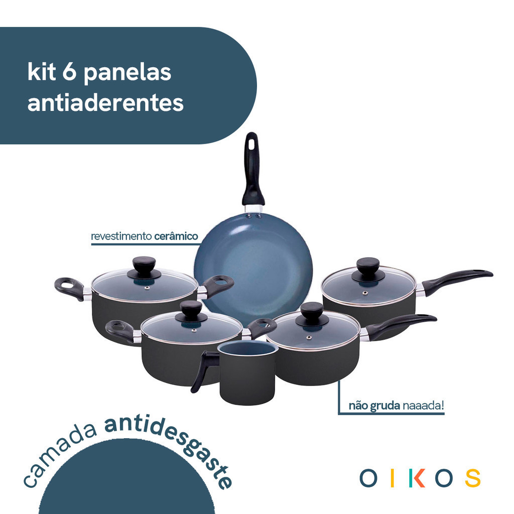 "conheça o jogo de panelas 6 pçs antiaderentes de cerâmica da coleção base da oikos! antiaderentes, com alta qualidade e design funcional, são ótimas para fazer suas receitas favoritas sem perigo de grudar alimentos ou ingerir substâncias tóxicas. além disso, possuem 5 camadas: antiaderente cerâmico, camada antidesgaste interna, alumínio, camada antidesgaste externa e pintura externa. a espessura é de 2mm: distribui melhor o calor e evita que os alimentos queimem! as panelas e caçarolas são de alumínio, cerâmica, aço inox, vidro temperado e baquelite. a frigideira e a leiteira são de alumínio, cerâmica e baquelite. podem ser usadas em fogão a gás e fogões elétricos convencionais. não vão em fogão por indução e nem no forno! cuidados: • ao remover as etiquetas, lave com detergente neutro e esponja macia em água morna. seque com um pano suave. • não utilize objetos pontiagudos ou de metal durante o cozimento. • para limpar basta utilizar esponja macia com detergente. • utilize um pouco de água, azeite, óleo ou manteiga antes de aquecer para ajudar na eficiência da antiaderência. • aguarde as panelas esfriarem completamente antes de lavar para evitar choque térmico e deformidades. • preparar alimentos pigmentados pode afetar a cor do revestimento interno. • utilizar sempre em fogo baixo ou médio evita superaquecimentos e deformidades na pintura externa. • a exposição ao fogo fora do espaço delimitado do fundo das panelas pode causar manchas e desbotamento na pintura externa. • levantar a panela em vez de arrastar evita arranhões no fundo. como fazer a cura da panela: basta aplicar uma pequena quantidade de óleo vegetal com o auxílio do papel toalha, aquecer em fogo baixo por 1 a 2 minutos e, após esfriar, é só lavar e secar! leve modernidade e praticidade para sua casa! o kit contém: 1 panela antiaderente oikos base: 16 cm capacidade: 1,3 L 1 panela antiaderente oikos base: 18 cm capacidade: 1,65 L 1 caçarola antiaderente oikos base: 18 cm capacidade: 1,65 L 1 caçarola antiaderente oikos base: 20 cm capacidade: 2,4 L 1 frigideira antiaderente oikos base: 20 cm capacidade: 0,75 L 1 leiteira antiaderente oikos base: 12 cm capacidade: 1,15 L"