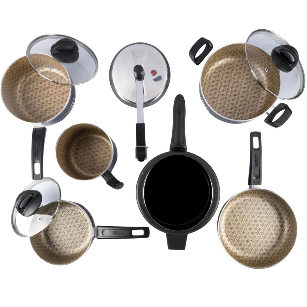 Cozinhar todos os dias fica muito mais prático quando você conta com um conjunto completo, funcional e pensado para facilitar sua rotina. Este jogo de panelas 6 peças com panela de pressão é ideal para quem gosta de preparar refeições caseiras com mais agilidade, sabor e segurança, tornando cada momento na cozinha mais leve e prazeroso. Produzido em alumínio, o conjunto oferece aquecimento rápido e cozimento uniforme, ajudando a realçar o sabor dos alimentos. O revestimento antiaderente facilita o preparo das receitas, reduz o uso de óleo e torna a limpeza muito mais simples, perfeito para o dia a dia corrido sem abrir mão do cuidado. O grande destaque é a panela de pressão de 4,5 litros, ideal para carnes macias, feijão, grãos e pratos que pedem rapidez sem perder o sabor. As demais peças completam o conjunto com versatilidade para diferentes preparos, do arroz soltinho aos molhos e refogados. Na cor preto clássico, o conjunto combina com qualquer cozinha e transmite elegância. Os cabos e alças proporcionam firmeza no manuseio e mais segurança durante o uso, trazendo tranquilidade em cada preparo. Um conjunto pensado para quem valoriza praticidade, durabilidade e prazer em cozinhar. Descubra como sua rotina pode ficar ainda melhor com panelas que acompanham seu ritmo. Ficha Técnica Medidas e dimensões: Panela 16cm- Altura: 7cm | Diâmetro: 16cm | Capacidade: 1,4L Panela 18cm- Altura: 8cm | Diâmetro: 18cm | Capacidade: 1,9L Caçarola 20cm- Altura: 9cm | Diâmetro: 20cm | Capacidade: 2,5L Frigideira 20cm- Diâmetro: 20cm | Comprimento: 33cm | Capacidade: 1,3L Fervedor 14 cm- Altura: 11,5cm | Diâmetro: 14cm | Comprimento: 20,5cm | Capacidade: 1,7L Panela de Pressão 4.5L- Altura: 19cm | Largura: 21cm | Diâmetro: 20cm | Comprimento: 39cm | Capacidade: 4,5L Material do corpo: Alumínio Material da alça/cabo: Baquelite Marca: Alumínio Nacional Fabricante: Alumínio Nacional Garantia: 90 dias Composição 02x Panelas com Tampa de Vidro 01x Caçarola com Tampa de Vidro 01x Frigideira 01x Fervedor 01x Panela de pressão 4,5L