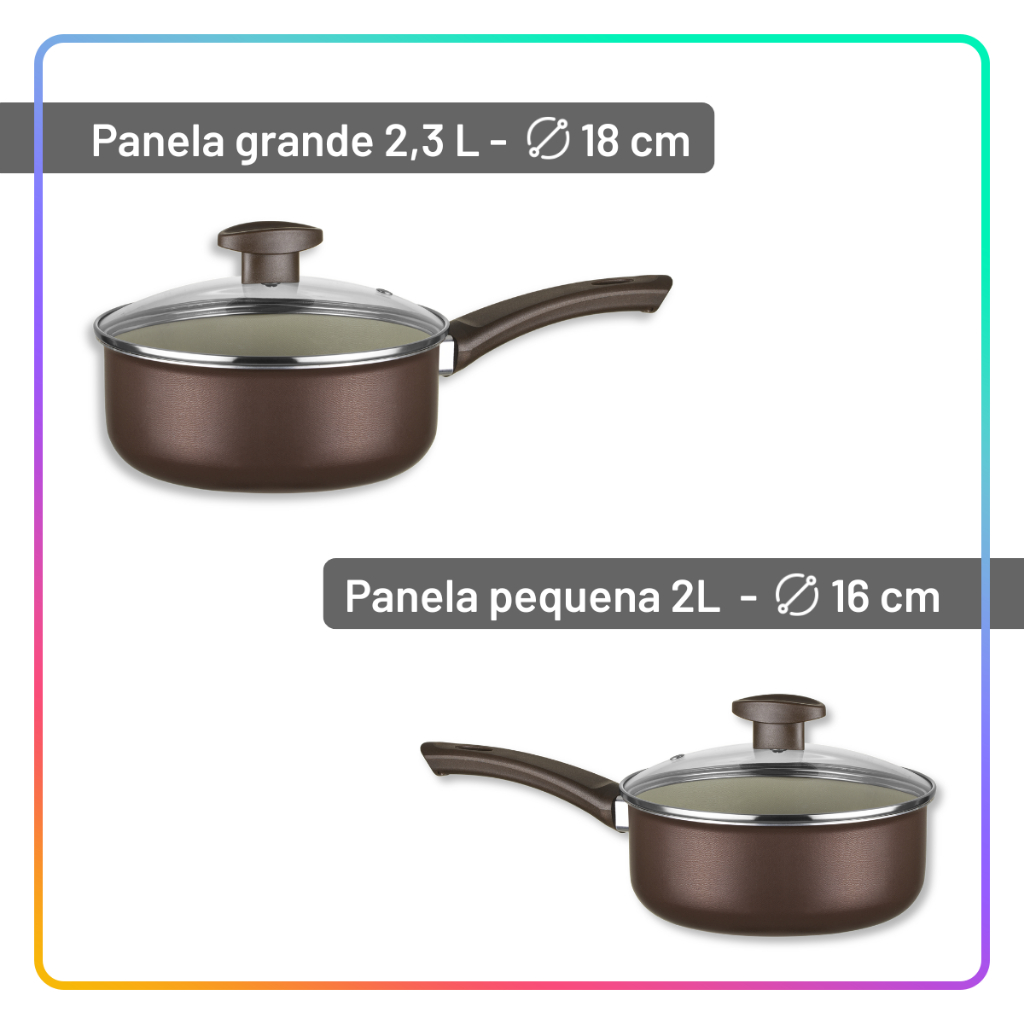 Jogo de Panelas Antiaderente com Utensílios da Linha Exclusiva Café Com este conjunto completo, preparar refeições para toda a família fica mais prático e agradável. As panelas antiaderentes facilitam o cozimento e a limpeza, trazendo funcionalidade para o dia a dia na cozinha. 🎨 As opções Mocha e Vanilla Latte possuem desenho interno exclusivo. ✅ Alumínio com 5 camadas de antiaderente: nada gruda; ✅ Cabos e alças de baquelite antitérmico: não esquentam; ✅ Tampas de vidro temperado com saída de vapor e borda inox; ✅ Cozimento rápido e uniforme; ✅ Pode ir à lava-louças; ✅ Compatível com fogões a gás. Conteúdo do conjunto: ➡️ 01 panela 16 cm — 1,3 L — altura 6,5 cm ➡️ 01 panela 18 cm — 2 L — altura 7 cm ➡️ 01 caçarola 18 cm — 2 L — altura 7 cm ➡️ 01 caçarola 20 cm — 2,7 L — altura 8 cm ➡️ 01 fervedor 14 cm — 1,6 L — altura 12 cm ➡️ 01 frigideira 22 cm ➡️ 01 frigideira 17 cm ➡️ 03 utensílios sortidos 💡 As tampas das caçarolas também servem nas frigideiras 🧼 Evite esponjas abrasivas para maior durabilidade do revestimento interno. Os cabos e alças podem variar de acordo com o lote de fabricação. Imagens meramente ilustrativas. As tonalidades podem variar de acordo com estoque, seu monitor ou até mesmo com a percepção dos seus olhos.
