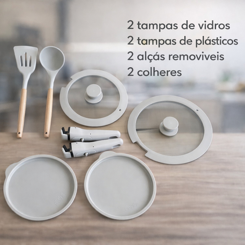 Jogo de Panelas Antiaderente c/ Alças Removíveis Tampa de Vidro Design Rosa/Cinza e Cerâmica Premium