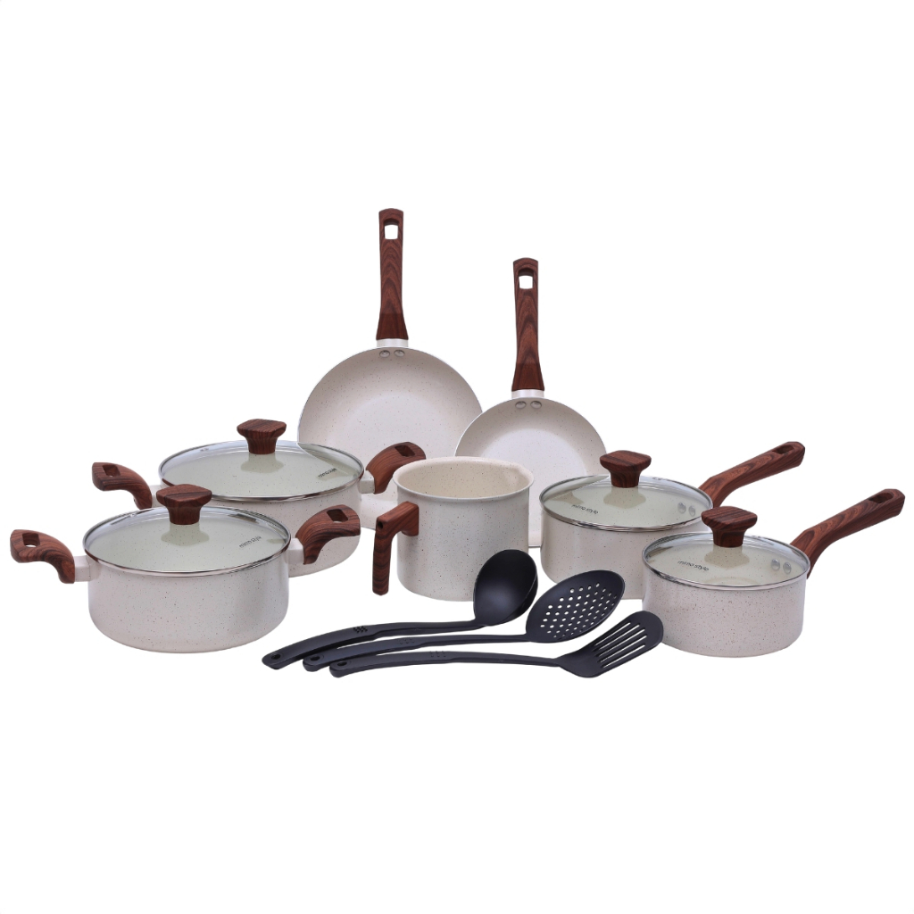 O anúncio contém: 01 Caçarola Grande, 01 Caçarola Pequena, 01 Panela Grande, 01 Panela Pequena, 01 Frigideira Grande, 01 Frigideira Pequena, 01 Fervedor/Canecão, 01 Espátula, 01 Concha ou Colher, 01 Escumadeira. Perguntas frequentes: Pode ir ao forno? Não. Pode ir ao micro-ondas? Não; Serve para fogão de indução? Sim. Informações do Jogo Crema, Chumbo e Vermelha: Dimensões aproximadas da Caçarola Grande (AxLxC): 15cm x 22,5cm x 37,5cm. Diâmetro aproximado: 22cm. – Capacidade: 3,6L – Peso: 1150g Dimensões aproximadas da Caçarola Pequena (AxLxC): 15cm x 20cm x 35cm. Diâmetro aproximado: 20cm. – Capacidade: 2,8L – Peso: 1030g. Dimensões aproximadas da Panela Grande (AxLxC): 13cmx 18,5cm x 35cm. Diâmetro aproximado: 18cm. – Capacidade: 2L – Peso: 804g Dimensões aproximadas da Panela Pequena (AxLxC): 13cm x 16,5cm x 32,5cm. Diâmetro aproximado: 16cm. – Capacidade: 1,5L – Peso: 695g. Dimensões aproximadas da Frigideira Grande (AxLxC): 7,5cm x 22,5cm x 39cm. Diâmetro aproximado: 22cm. – Capacidade: 1,2L – Peso: 400g Dimensões aproximadas da Frigideira Pequena (AxLxC): 7,5cm x 18cm x 35cm. Diâmetro aproximado: 17,5cm. – Capacidade: 0,75L – Peso: 330g Dimensões aproximadas do Fervedor (AxLxC): 12cm x 15,5cm x 19cm. Diâmetro aproximado do Fervedor: 14cm. – Capacidade: 2L – Peso: 350g Dimensões aproximadas da Espátula (AxLxC): 04cm x 09cm x 32,5cm. Dimensões aproximadas da Concha (AxLxC): 09cm x 8,5cm x 30cm. Dimensões aproximadas da Escumadeira (AxLxC): 06cm x 11,5cm x 34cm. Espessura das panelas: 2mm. Informação do Jogo Marmol: Dimensões aproximadas da Caçarola Grande (AxLxC): 22cm x 9,5 cm Diâmetro aproximado: 22cm. – Capacidade: 3,6L – Peso: 1,150g. Dimensões aproximadas da Caçarola Pequena (AxLxC): 20cm x 9cm.. Diâmetro aproximado: 20cm. – Capacidade: 2,8L – Peso: 1,010g. Dimensões aproximadas da Panela Grande (AxLxC): 18 cm x 8 cm. Diâmetro aproximado: 18cm. – Capacidade: 2L – Peso: 0,790g Dimensões aproximadas da Panela Pequena (AxLxC): 16cm x 7,5cm. Diâmetro aproximado: 16cm. - Capacidade: 1,5L. - Peso: 0,688g. Dimensões aproximadas da Frigideira Grande (AxLxC): 22 cm x 4,1 cm. Diâmetro aproximado: 22cm. – Capacidade: 1,2L – Peso: 0,410g. Dimensões aproximadas da Frigideira Pequena (AxLxC): 18cm x 3,8cm. Diâmetro aproximado: 18cm. – Capacidade: 0,75L – Peso: 300g Dimensões aproximadas do Fervedor (AxC): 14cm x 12,5cm – Diâmetro Aproximado: 14cm - Capacidade aproximada: 1,92L. – Peso: 0,350g. Dimensões aproximadas da Espátula, Concha e Escumadeira (AxLxC): 30cm x 06cm x 1cm. Espessura das 7 panelas: Borda 4mm, Corpo 2,3mm e Fundo 2,7mm. Linha: Pratic Style Cook. **ATENÇÃO** O Fervedor / Leiteira funciona apenas em cooktops de indução com boca(s) maior(es) que 16 centímetros de diâmetro. Fundo da Panelas de todos os jogos: Triplo. Fogões Compatível: Gás, Elétrico, Vitrocerâmico, Indução. Material: Alumínio, Baquelite, Vidro Temperado e inox. Fabricante: Mimo Style.