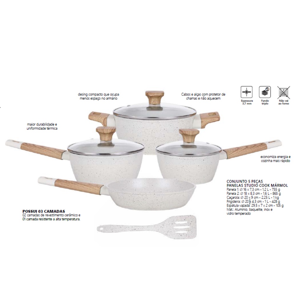 Essas panelas também possuem pegadores que não esquentam de forma alguma e possuem uma cor e acabamento perfeitos, o que as torna seguras para serem usadas no fogão e forno e até mesmo na lava-louças. Tornando a sua cozinha muito mais segura. Perfeito para uso diário porque não retém odores, sabores e não libera toxinas na sua comida. É um material que resiste às altas temperaturas, se bem cuidado, pode durar a vida toda. Não perca mais tempo com panelas de baixa qualidade! Adquira agora mesmo e comece a preparar seus pratos favoritos com facilidade e qualidade. CONJUNTO DE PANELAS Panela: Ø 18 x 8 cm - 1,6 L - 985 g Caçarola: Ø 20 x 9 cm - 2,15 L - 1,1 kg Frigideira: Ø 20 x 4,5 cm - 0,9 L - 388 g Espátula: 21,5 x 4,5 x 1 cm - 45 g Meia espátula: 21,5 x 4,5 x 1 cm - 50 g Mat.: Alumínio, baquelite, inox e vidro temperado