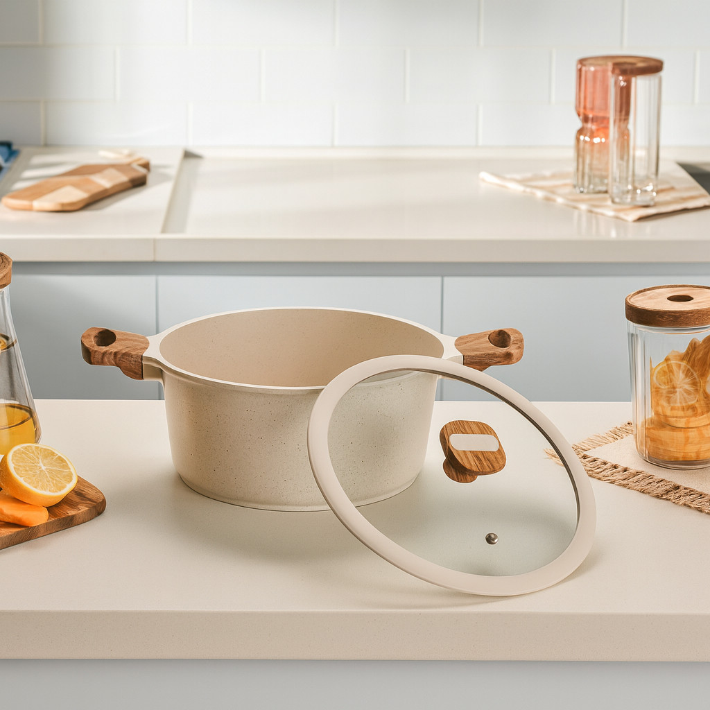 Conjunto de Panelas Titanium 3 Peças com Fundo de Indução – Vanilla MTA Eficiência, Estilo e Alta Performance para a Sua Cozinha O Conjunto Titanium 3 Peças da MTA é ideal para quem busca qualidade, sofisticação e funcionalidade no preparo das refeições. Fabricado em alumínio injetado com revestimento cerâmico Classe A, proporciona alta durabilidade, cozimento rápido e limpeza facilitada. Seu fundo com tecnologia de indução permite economia de energia e compatibilidade com diversos tipos de fogão. Com design elegante na cor vanilla, o conjunto traz cabos e alças com toque macio (soft-touch), oferecendo conforto e segurança no manuseio. As tampas de vidro temperado com borda de silicone ajudam a manter o calor e o sabor dos alimentos durante o preparo. Diferenciais do produto: Estrutura em alumínio injetado: resistência e excelente condução térmica Revestimento cerâmico antiaderente Classe A: preparo mais saudável e limpeza prática Fundo indutivo: compatível com fogões de indução, gás, elétrico e vitrocerâmico Cabos com soft-touch: toque macio, firmeza e segurança ao manusear Tampas em vidro temperado com borda de silicone: vedação eficiente e visual moderno Livre de PFOA: mais segurança e saúde no preparo dos alimentos Conteúdo do conjunto: 01 panela com tampa 01 caçarola com tampa 01 frigideira Especificações técnicas: Material: Alumínio injetado com revestimento cerâmico Espessura: 3,2 mm Antiaderência: Classe A Compatibilidade: Indução, gás, elétrico e vitrocerâmico Não compatível com lava-louças Dimensões da embalagem: 48 cm (C) x 26 cm (L) x 18 cm (A) Peso total: 4,592 kg Funcionalidade, durabilidade e sofisticação para uma rotina culinária mais leve, segura e eficiente.
