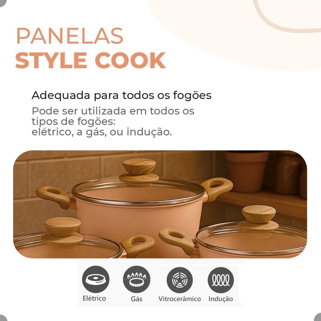 DESCRIÇÃO PANELAS MIMO STYLE (STYLE COOK MARMOL BAMBU) — PJ10YMM Dê um toque de sofisticação à sua cozinha com o Conjunto de Panelas Style Cook. Elegância, praticidade e tecnologia se unem em um produto ideal para tornar suas experiências culinárias ainda mais agradáveis e eficientes. CARACTERÍSTICAS Revestimento Cerâmico: Superfície interna e externa antiaderente que facilita o preparo dos alimentos e a limpeza. Fundo de Indução: Compatível com fogões elétricos, a gás, vitrocerâmicos e de indução. Cabos de Baquelite com Revestimento Soft-Touch: Oferecem conforto, segurança e proteção contra chamas. Tampas de Vidro Temperado com Saída de Vapor: Permitem visualizar o preparo sem perda de calor. Espessura de 3 mm: Garantia de resistência e distribuição uniforme de calor. BENEFÍCIOS Praticidade no Dia a Dia: Ideal para preparar uma ampla variedade de pratos com rapidez e facilidade. Durabilidade e Elegância: Materiais de alta qualidade que combinam estilo com resistência. Versatilidade: Adequado para diversos tipos de fogões e perfeito para uso diário ou ocasiões especiais. Economia de Tempo: A antiaderência reduz o uso de óleo e facilita a limpeza, deixando mais tempo para o que realmente importa. ESPECIFICAÇÕES Material: Alumínio com revestimento cerâmico, baquelite, inox e vidro temperado. Dimensões e Capacidades: Caçarola 1: 34 cm x 22 cm x 14 cm - 3,5L Caçarola 2: 36 cm x 20 cm x 15,5 cm - 1,9L Panela 1: 37,5 cm x 20 cm x 14,5 cm - 2,05L Panela 2: 33,5 cm x 16 cm x 13,5 cm - 1,3L Frigideira 1: 38 cm x 22 cm x 8 cm - 1,2L Frigideira 2: 37,5 cm x 18 cm x 6 cm - 0,9L Leiteira: 19,5 cm x 14 cm x 12 cm - 1,5L Colher de Arroz: 30 cm x 6 cm x 1 cm Colher Vazada: 30 cm x 6 cm x 1 cm Espátula: 30 cm x 6 cm x 1 cm Espessura: 3 mm Cor: Marmol Marca: Mimo Style INMETRO: 003005/2022 LISTA DE EMBALAGEM 2 Caçarolas com Tampas 2 Panelas com Tampas 2 Frigideiras 1 Leiteira 1 Colher de Arroz 1 Colher Vazada 1 Espátula Transforme sua cozinha com o Conjunto de Panelas Style Cook, que alia funcionalidade, resistência e design sofisticado para suas receitas diárias ou ocasiões especiais. É o toque final que sua cozinha merece!