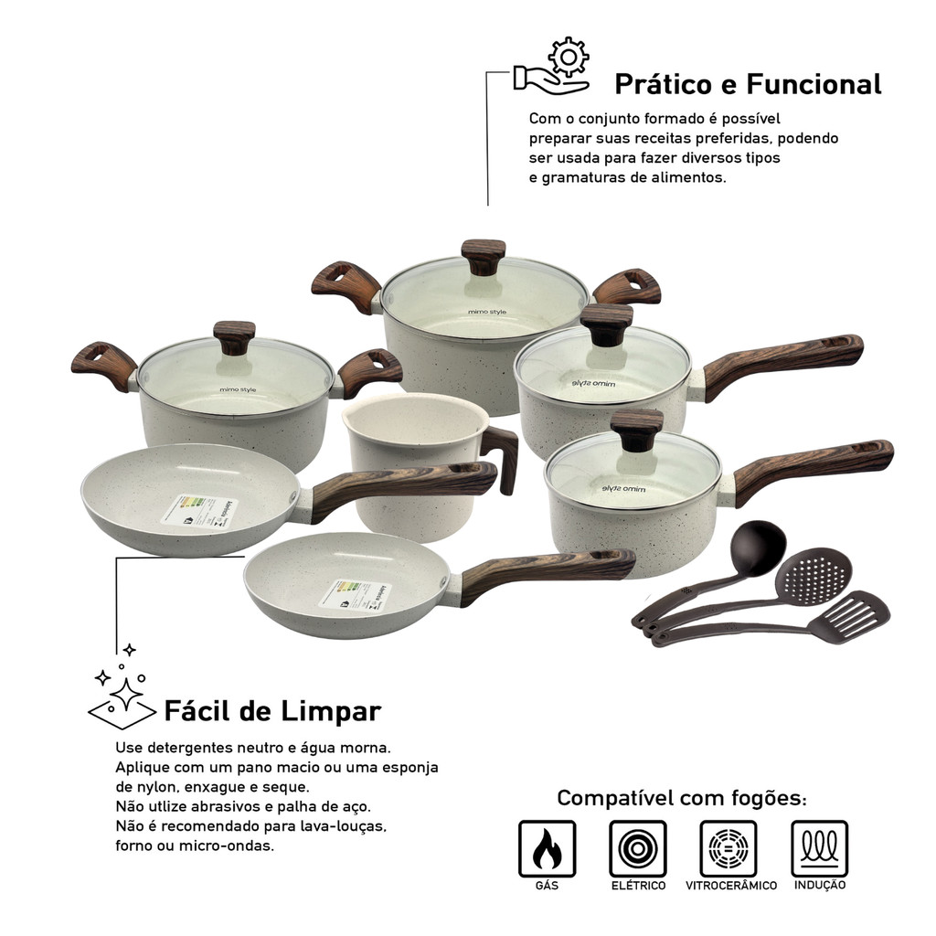 A linha Cook da Mimo Style é a solução perfeita para preparar suas receitas favoritas com praticidade, funcionalidade e qualidade excepcionais. Composta por 10 peças, cada item do conjunto possui uma base tripla em alto relevo com fundo de indução, projetada para evitar marcas que possam danificar o seu fogão. Destaques do Produto: Compatibilidade Universal: As panelas Style Cook são adequadas para todos os tipos de fogões, incluindo elétricos, vitrocerâmicos, indução e a gás, garantindo versatilidade na sua cozinha. Revestimento Cerâmico em 3 Camadas: O conjunto é extremamente funcional e saudável, com 2 camadas de revestimento cerâmico e 1 camada resistente a alta temperatura, proporcionando um cozimento mais saudável com menos óleo. Distribuição Uniforme de Calor: O material de alta qualidade conduz o calor de forma uniforme, reduzindo o consumo de gás e energia, permitindo que você cozinhe os alimentos em fogo baixo ou médio. Design Funcional: As panelas são práticas e ocupam pouco espaço em seu armário. Desenvolvidas para não permitir que os alimentos grudem, são livres de metais pesados e elementos prejudiciais à saúde. Alças e Cabos com Revestimento Soft-Touch: O revestimento soft-touch oferece segurança e conforto ao manusear as panelas, evitando queimaduras e proporcionando um toque suave. Facilidade de Uso e Higienização: Tampas de Vidro Temperado: Permitem que você acompanhe o cozimento das refeições sem precisar abrir a tampa, garantindo praticidade e eficiência. Fácil Higienização: Para manter as panelas em ótimo estado, basta utilizar detergentes neutro e água morna, evitando o uso de abrasivos ou palha de aço. Importante: As panelas não podem ir ao forno, micro-ondas ou lava-louças. Para ativar a funcionalidade antiaderente e garantir a durabilidade, é necessário seguir o processo de cura recomendado pelo fabricante. Composição do Conjunto: 01 - Panela 16cm 1,5 Litros Indução 01 - Panela 18cm 2,0 Litros Indução 01 - Panela Caçarola 20cm 2,8 Litros Indução 01 - Panela Caçarola 22cm 3,6 Litros Indução 01 - Fervedor 14cm 2,0 Litros Indução 01 - Frigideira 18cm 0,7 Litros Indução 01 - Frigideira 22cm 1,2 Litros Indução 01 - Espatula Vazada 01 - Escumadeira Vazada 01 - Concha de feijao Especificações: Revestimento: Antiaderente com 3 camadas (2 camadas de revestimento cerâmico e 1 camada resistente a alta temperatura). Espessura: Revestimento 4 mm / Corpo 2,3 mm / Fundo 2,7 mm. Fundo: Triplo Indução para eficiência energética e cozimento mais rápido. Cabo: Em baquelite com revestimento Soft-Touch. Transforme Suas Receitas com Estilo: Com o Jogo de Panelas 10 Peças Cerâmica Indução Mimo Style Cook, seus alimentos ficarão ainda mais saborosos e sua cozinha mais organizada e eficiente. Este conjunto foi projetado para proporcionar praticidade, saúde e sofisticação em cada detalhe.