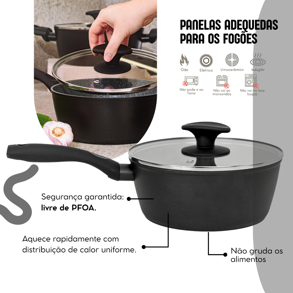 Jogo de Panelas Ceramic Life Indução Brinox 5 Peças – Beleza, Praticidade e Alto Desempenho na Sua Cozinha Eleve o nível da sua cozinha com o Jogo de Panelas Ceramic Life Brinox 5 Peças, ideal para quem busca eficiência, estilo e qualidade. Com design moderno e acabamento sofisticado, esse conjunto é perfeito para o preparo de receitas simples ou elaboradas, com mais praticidade e segurança. >>>>>Destaques do Produto<<<<< Revestimento cerâmico antiaderente de alta performance (classificação A): alimentos não grudam e a limpeza é muito mais fácil. Compatível com todos os tipos de fogões, incluindo indução: graças ao fundo especial em inox que conduz as correntes magnéticas. Corpo em alumínio com 3mm de espessura: garante distribuição uniforme de calor e maior durabilidade. Tampas em vidro temperado com saída para vapor: permitem visualizar o preparo sem perder temperatura. Cabos e alças com revestimento Soft-Touch: toque macio e que não esquenta durante o uso, proporcionando conforto e segurança. Livre de PFOA: produto atóxico e seguro para o uso diário. >>>>>Dimensões das Peças<<<<< Caçarola 1 : 22cm x 9cm – 2,7L Caçarola 2: 20cm x 8,5cm – 2,1L Panela 1: 20cm x 8,5cm – 2,1L Panela 2: 18cm x 8,0cm – 1,5L Frigideira 1: 22cm x 4,5cm – 1,2L >>>>>Total: 5 peças<<<<< O Jogo de Panelas Ceramic Life Brinox é a escolha ideal para quem busca unir desempenho, beleza e funcionalidade em um só conjunto.