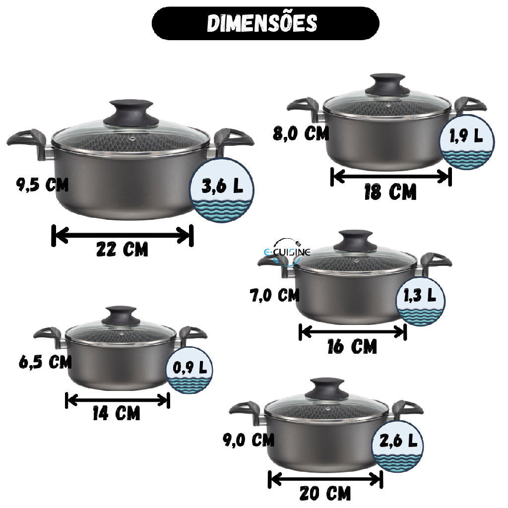 Jogo de Panelas Caçarola 9 peças Antiaderente Teflon 6 Camadas Grafite Kit