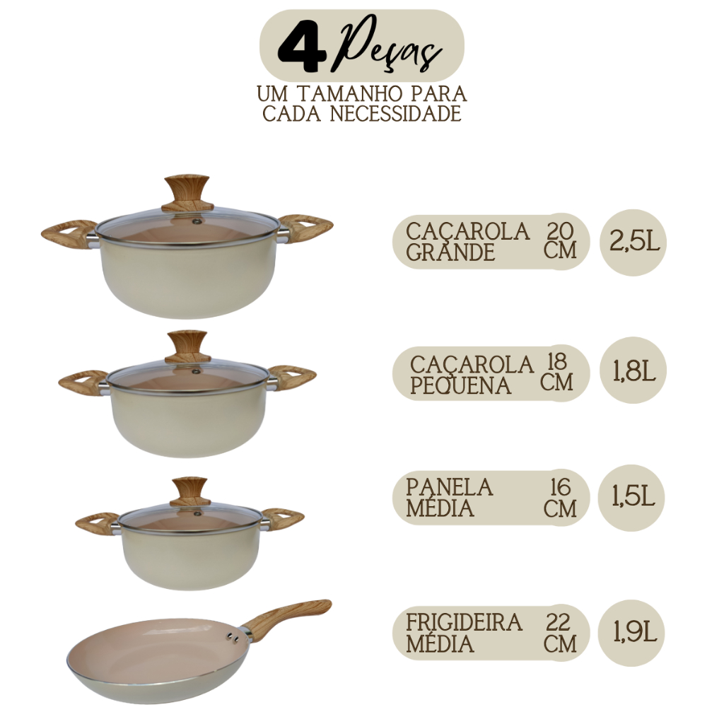 Jogo de Panelas Caçarola Frigideira Cerâmica Antiaderente 4 peças