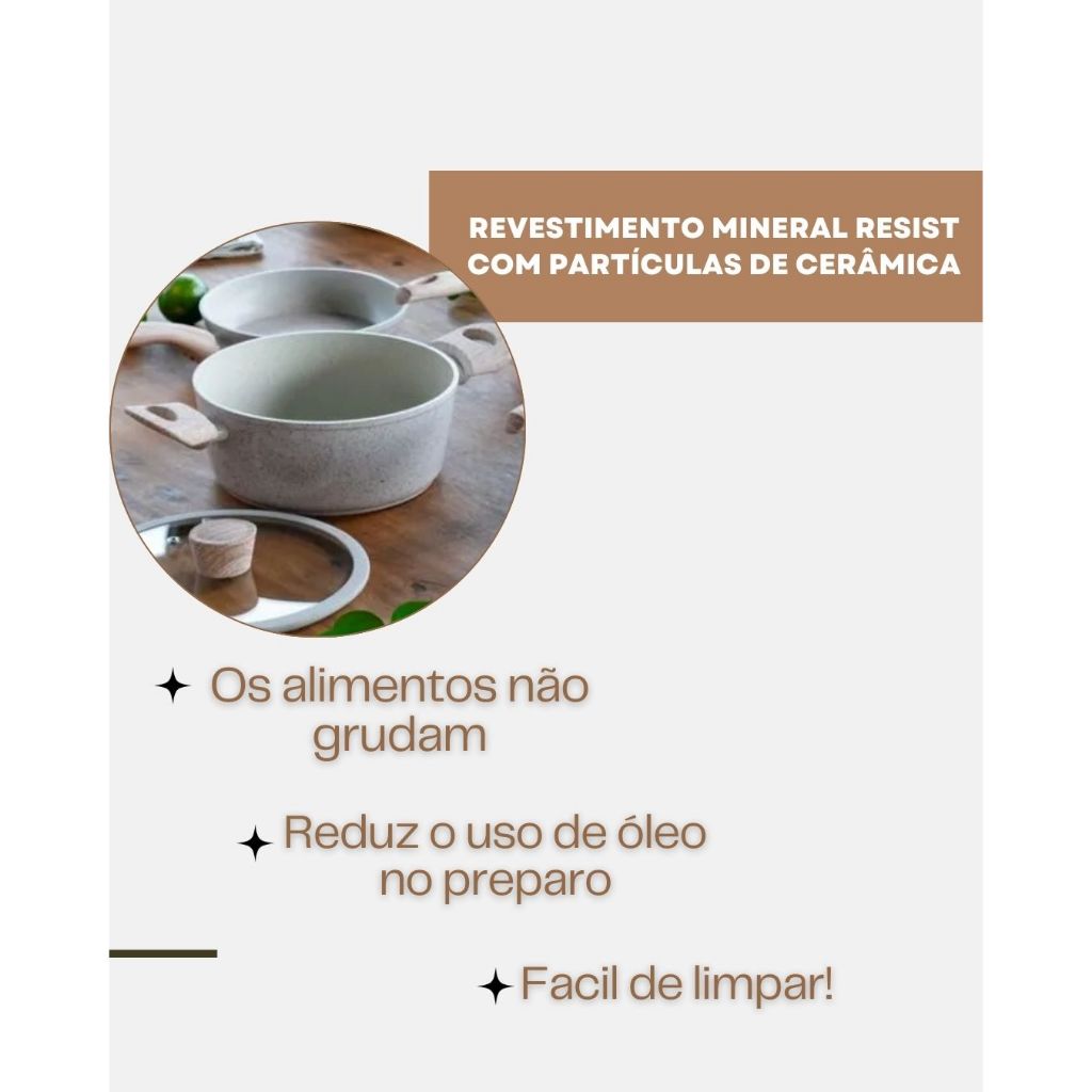 Transforme sua cozinha com o Jogo de Panelas Brinox Ceramic Life 6 Peças Sirius na elegante cor Vanilla. Este conjunto completo oferece qualidade e praticidade para o seu dia a dia, com a tecnologia Ceramic Life que garante uma superfície antiaderente e facilita o preparo de receitas mais saudáveis. Além disso, as panelas possuem excelente distribuição de calor e são ideais para todos os tipos de fogões (gás, elétrico e vitrocerâmico). Itens Inclusos: 01 Panela com tampa Ø 18 x 8 cm – 1,5 Litros 01 Panela com tampa Ø 20 x 8,5 cm – 2,1 Litros 01 Caçarola com tampa Ø 22 x 9 cm – 2,7 Litros 01 Caçarola com tampa Ø 24 x 10 cm – 4 Litros 01 Frigideira Alta Antiaderente Ø 24 x 6,7 cm 01 Frigideira Antiaderente Ø 22 x 4,5 cm – 1,2 Litros Cura da Superfície Antiaderente: Para garantir a durabilidade e o melhor desempenho das panelas, recomenda-se fazer a cura antes do primeiro uso. Basta aplicar uma fina camada de óleo na superfície interna, aquecer a panela em fogo baixo por cerca de 5-10 minutos e deixar esfriar. Esse processo cria uma camada protetora e prolonga a vida útil das panelas. Sku: 180663