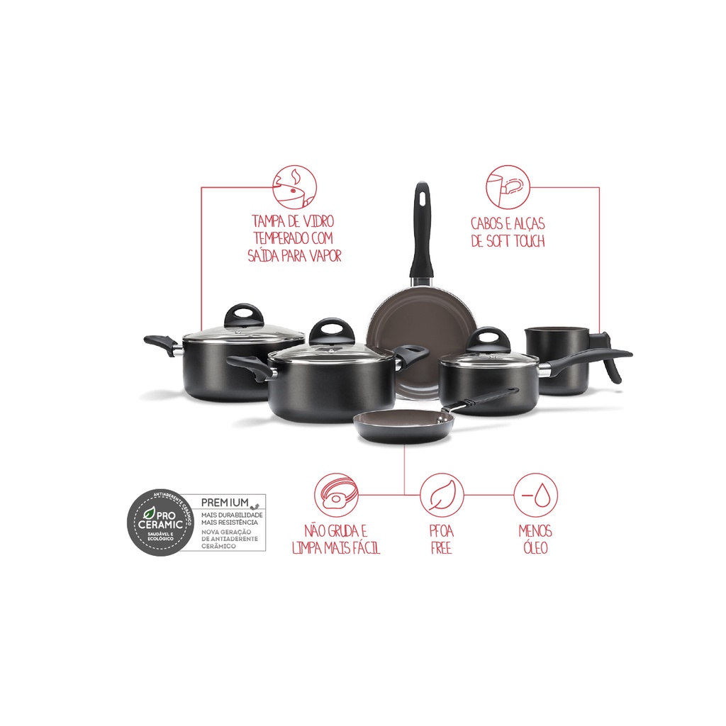 O conjunto é composto por duas caçarolas com tampas (22x10,5 cm e 3,55 litros e 20x9,5 cm e 2,55 litros), duas frigideiras (20x3,5 cm e 0,6 litro e 14x2,5 cm e 0,2 litro), uma panela com tampa (16x8 cm e 1,25 litro) e um fervedor (11x12,5 cm e 1 litro), todos na elegante cor preta.