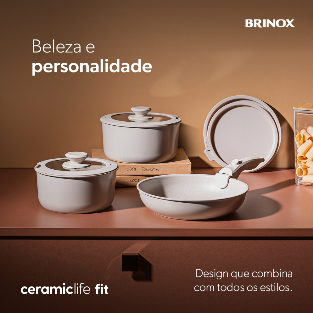 Muito além de panelas: um sistema inteligente para cozinhar, armazenar e organizar. O Jogo de Panelas Empilhável Brinox Ceramic Life Fit combina tecnologia, praticidade e design sofisticado. Acompanha: 1 Panela Grande 20x10cm - 2.8L 1 Panela Média 18x9cm - 2L 1 Frigideira Grande 24x5.2cm - 1.9L 2 Protetores de Panelas 1 Cabo Removível 18.5x4x5cm 1 Tampa Plástica 18cm 1 Tampa Plástica 20cm 1 Tampa de Vidro 20cm 1 Tampa de Vidro 18cm Com cabo removível, as peças se encaixam perfeitamente, permitindo o empilhamento e ocupando até 70% menos espaço nos armários. O revestimento cerâmico antiaderente, livre de PFOA e metais pesados, garante um cozimento saudável, sem que os alimentos grudem, e facilita a limpeza. Versátil, pode ir ao forno (sem o cabo), ampliando as possibilidades na hora de preparar suas receitas. Acompanha tampas plásticas permitindo armazenar os alimentos na geladeira de forma segura e organizada, sem precisar trocar de recipiente. Seu acabamento na cor Areia, com detalhes marmorizados, proporciona um toque moderno e elegante, perfeito para levar as panelas direto à mesa e servir com estilo. As tampas flat de vidro temperado, com borda de silicone, oferecem vedação eficiente, controle do vapor e um encaixe silencioso, elevando sua experiência na cozinha. O cabo removível possui revestimento de toque macio, proporcionando um manuseio seguro e confortável. Com fundo de indução, é compatível com todos os tipos de fogões, inclusive indução, e garante um aquecimento rápido e uniforme, trazendo mais eficiência ao dia a dia. Se você busca inovação, funcionalidade e design inteligente, o Jogo de Panelas Ceramic Life Fit é a escolha ideal para transformar sua rotina e deixar sua cozinha ainda mais moderna e organizada. Smart Cooking. Smart Storage.
