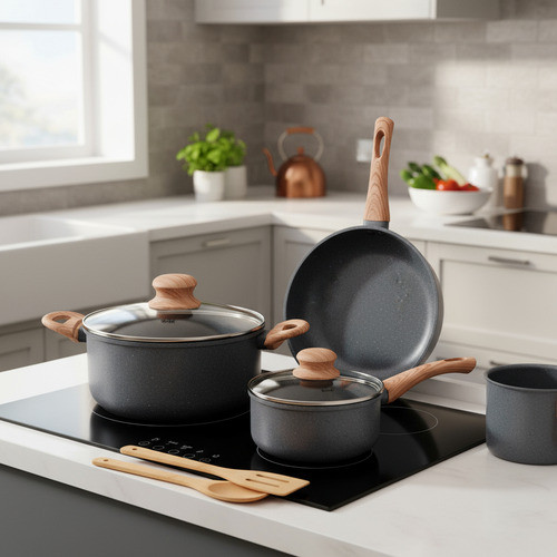 Cozinhe com mais estilo, saúde e praticidade todos os dias! O Jogo de Panelas 7 Peças Ecoglide Granite Premium foi desenvolvido para quem busca desempenho, durabilidade e elegância na cozinha. Com revestimento cerâmico antiaderente e estrutura de alumínio de alta resistência, o conjunto garante aquecimento rápido, economia de energia e preparo mais saudável, sem que os alimentos grudem. O design na cor Granite, com acabamento sofisticado e tampas de vidro temperado, transforma sua cozinha em um ambiente moderno e funcional — perfeito para o uso diário ou para presentear. QUALIDADE E DESEMPENHO QUE FAZEM A DIFERENÇA – Revestimento cerâmico antiaderente premium, livre de PFOA e PTFE, para um cozimento saudável e fácil de limpar. – Estrutura de alumínio reforçado, que distribui o calor de forma uniforme e garante maior durabilidade. – Compatível com todos os fogões, inclusive por indução, vitrocerâmico e elétrico. – Tampas de vidro temperado com saída de vapor, que permitem acompanhar o preparo sem perder calor. – Cabos e pegadores de baquelite antitérmico, que não esquentam e oferecem mais segurança. – Design sofisticado na cor Granite, unindo modernidade e praticidade. – Economia de até 30% de gás e energia, graças à eficiência térmica do material. BENEFÍCIOS DO REVESTIMENTO CERÂMICO ECOGLIDE – Cozimento mais saudável, sem necessidade de óleo ou gordura. – Limpeza simples e rápida, sem esforço. – Maior durabilidade contra riscos e manchas. – Aquecimento uniforme e preparo mais eficiente. – Ideal para receitas do dia a dia ou pratos elaborados. RECOMENDAÇÕES DE USO E CUIDADOS – Antes do primeiro uso, faça a cura: unte o interior com óleo, aqueça por alguns minutos e lave normalmente. – Evite choques térmicos e não leve ao forno, micro-ondas ou lava-louças. – Utilize utensílios de bambu, silicone ou madeira para não danificar o revestimento. – Lave sempre com esponja macia e detergente neutro. – Encha até no máximo ¾ da capacidade total da peça. – Guarde as panelas secas e limpas para preservar o acabamento cerâmico. FICHA TÉCNICA – Material: Alumínio, cerâmica, baquelite e vidro temperado – Revestimento: Cerâmico antiaderente – Cor: Granite (cinza granito) – Tipo de fogão: Gás, elétrico, vitrocerâmico e indução – Tampas: Vidro temperado com respiro – Cabos: Baquelite antitérmico – Livre de PFOA e PTFE – Uso: Doméstico e profissional – Resistência: Alta durabilidade e aquecimento uniforme ITENS INCLUSOS – 01 Leiteira 14 cm – 01 Panela 16 cm com tampa de vidro – 01 Caçarola 20 cm com tampa de vidro – 01 Frigideira 16 cm – 01 Frigideira 20 cm – 01 Colher de arroz em bambu 30 cm – 01 Espátula vazada em bambu 30 cm