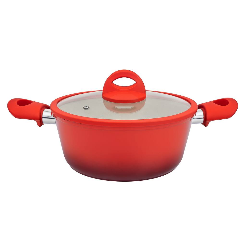 O Jogo de Panelas Casambiente Miami foi criado para quem busca praticidade, alta performance e um visual moderno na cozinha. Com acabamento sofisticado na cor vermelha e revestimento cerâmico de qualidade superior, o conjunto oferece cozimento uniforme, maior eficiência no preparo dos alimentos e um toque de elegância que transforma o ambiente culinário. Fabricado em alumínio robusto, o kit conta com fundo triplo compatível com todos os tipos de fogão, além de cabos em silicone soft-touch que garantem conforto e segurança durante o uso. As tampas em vidro temperado com bordas em silicone permitem acompanhar o preparo dos alimentos com controle e estabilidade, tornando a experiência na cozinha ainda mais agradável. Características: Marca: Casambiente Modelo: Miami Cor: Vermelha Material: Alumínio reforçado com revestimento cerâmico premium Revestimento: Cerâmico antiaderente, livre de PTFE e PFOA Compatibilidade: Indução, gás, elétrica e vitrocerâmica Fundo: Triplo, garantindo aquecimento mais uniforme Cabos: Silicone soft-touch, confortáveis e resistentes ao calor Tampas: Vidro temperado com saída de vapor e bordas em silicone Peças inclusas: Frigideira 24cm – 1,8L Panela 16cm – 1,2–1,3L com tampa Panela 18cm – 1,7L com tampa Caçarola 20cm – 2,3L com tampa Caçarola 24cm – 4L com tampa (que também se ajusta à frigideira) Benefícios: Aquecimento rápido e uniforme para maior eficiência no preparo Revestimento antiaderente que facilita a limpeza Cabos ergonômicos que oferecem segurança no manuseio Design moderno que valoriza qualquer cozinha Durabilidade superior mesmo em uso intenso Cuidado e Limpeza: 1.Antes do primeiro uso, lave e enxágue e seque cuidasosamente. Coloque uma fina camada de óleo para cozinhar 2.Use somente espátula de silicone ou madeira para cozinhar. Espátulas de metal podem danificar o produto. 3.Use temperatura baixa ou media para melhores resultados pois a base da panela garante distribuição do calor com eficiencia por toda a superficie. 4.Evite esquentar o produto vazio. 5.Resfrie as panelas antes de lavar. Remova as manchas com agua morna ou sabão neutro. Não usar abrasivos na limpeza. 6.Não pode ser usado em forno convencional ou microondas.
