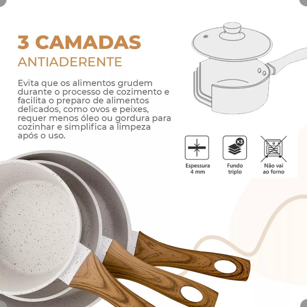 PANELAS MIMO STYLE (STYLE COOK MARMOL BAMBU) — PJ10YMM Dê um toque de sofisticação à sua cozinha com o Conjunto de Panelas Style Cook. Elegância, praticidade e tecnologia se unem em um produto ideal para tornar suas experiências culinárias ainda mais agradáveis e eficientes. CARACTERÍSTICAS Revestimento Cerâmico: Superfície interna e externa antiaderente que facilita o preparo dos alimentos e a limpeza. Fundo de Indução: Compatível com fogões elétricos, a gás, vitrocerâmicos e de indução. Cabos de Baquelite com Revestimento Soft-Touch: Oferecem conforto, segurança e proteção contra chamas. Tampas de Vidro Temperado com Saída de Vapor: Permitem visualizar o preparo sem perda de calor. Espessura de 3 mm: Garantia de resistência e distribuição uniforme de calor. BENEFÍCIOS Praticidade no Dia a Dia: Ideal para preparar uma ampla variedade de pratos com rapidez e facilidade. Durabilidade e Elegância: Materiais de alta qualidade que combinam estilo com resistência. Versatilidade: Adequado para diversos tipos de fogões e perfeito para uso diário ou ocasiões especiais. Economia de Tempo: A antiaderência reduz o uso de óleo e facilita a limpeza, deixando mais tempo para o que realmente importa. ESPECIFICAÇÕES Material: Alumínio com revestimento cerâmico, baquelite, inox e vidro temperado. Dimensões e Capacidades: Caçarola 1: 34 cm x 22 cm x 14 cm - 3,5L Caçarola 2: 36 cm x 20 cm x 15,5 cm - 1,9L Panela 1: 37,5 cm x 20 cm x 14,5 cm - 2,05L Panela 2: 33,5 cm x 16 cm x 13,5 cm - 1,3L Frigideira 1: 38 cm x 22 cm x 8 cm - 1,2L Frigideira 2: 37,5 cm x 18 cm x 6 cm - 0,9L Leiteira: 19,5 cm x 14 cm x 12 cm - 1,5L Colher de Arroz: 30 cm x 6 cm x 1 cm Colher Vazada: 30 cm x 6 cm x 1 cm Espátula: 30 cm x 6 cm x 1 cm Espessura: 3 mm Cor: Marmol Marca: Mimo Style INMETRO: 003005/2022 LISTA DE EMBALAGEM 2 Caçarolas com Tampas 2 Panelas com Tampas 2 Frigideiras 1 Leiteira 1 Colher de Arroz 1 Colher Vazada 1 Espátula Transforme sua cozinha com o Conjunto de Panelas Style Cook, que alia funcionalidade, resistência e design sofisticado para suas receitas diárias ou ocasiões especiais. É o toque final que sua cozinha merece!