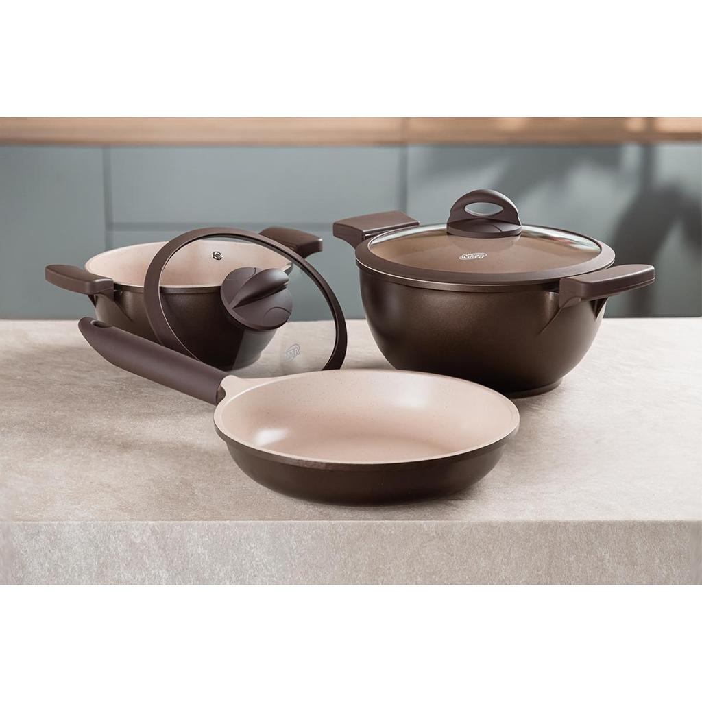 Jogo de Panelas MTA Belga Alumínio Injetado Antiaderente Indução Cerâmica 3 Peças - 8407 Descubra o Conjunto de Panelas Belga MTA com revestimento cerâmico, ideal para quem busca praticidade e saúde na cozinha. Com 3 peças essenciais, incluindo duas panelas com tampas de vidro e uma frigideira, esse conjunto alia durabilidade e design sofisticado em acabamento marrom com interior claro, facilitando o controle do cozimento. Revestimento cerâmico antiaderente que permite cozinhar com menos óleo, preservando os nutrientes dos alimentos Distribuição uniforme de calor para preparos rápidos e saborosos Tampas de vidro com saída de vapor que mantêm o alimento na temperatura ideal Cabo ergonômico em material resistente ao calor, garantindo segurança e conforto no manuseio Fácil limpeza, compatível com lava louças Perfeito para quem valoriza uma cozinha funcional e elegante, o conjunto Belga MTA é a escolha certa para transformar suas receitas diárias em momentos especiais. Aproveite a qualidade e eficiência deste kit que une tecnologia e estilo. ESPECIFICAÇÕES Marca: MTA Modelo: 8407 Linha: Belga Materiais: Alumínio Injetado Peças incluídas: 3 Com revestimento antiaderente: Sim Itens Inclusos Caçarola N20 - 2,4L Caçarola N24 - 4,3L Frigideira Alta N24 - 1,9L Imagens de caráter ilustrativo. Informações divulgadas de acordo com o manual do fabricante. Produto novo na caixa, lacrado com garantia do fabricante de 3 meses. Em caso de dúvidas sobre informações técnicas, utilização, limitações e manuseio do produto, verifique o manual do fabricante. NAC013611 EAN7897186684079