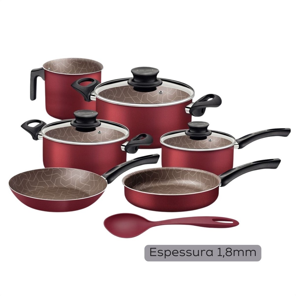 O anúncio contém: 01 Frigideira, 01 Frigideira Reta, 01 Caçarola Grande, 01 Panela Grande, 01 Panela pequena, 01 Fervedor e 1 utensílio. Perguntas frequentes: É antiaderente? Sim. Pode ir na lava louças? Sim. Serve para fogão elétrico? Sim, para elétrico e a gás. Serve para fogão de indução? Não; O jogo de panelas Tramontina Paris em alumínio com revestimento interno e externo antiaderente Starflon Max vermelho 7 Peças têm itens especiais para o sucesso das suas tarefas na cozinha! Ele tem peças produzidas em alumínio com revestimento interno e externo antiaderente Starflon Max, atributos que proporcionam o cozimento uniforme dos alimentos e evita que eles grudem em suas superfícies. Benefícios: Suas panelas e a caçarola possuem tampas de vidro temperado com bordas em aço inox e seus cabos e alças são em baquelite antitérmico e os pegadores em nylon, materiais que proporcionam um manuseio seguro e confortável, pois não aquecem. Além disso, é um jogo fácil de limpar e que pode ir à máquina de lavar louças. Com a Tramontina, você tem o melhor para equipar sua cozinha! Recomendações de Uso: A capacidade volumétrica máxima para cozimento é de 3/4 da capacidade total da peça. Posicione os cabos dos utensílios voltados ao centro do fogão. Em fogões com grade, centralize as peças sobre a chama ou fonte de calor e alinhe os cabos com a grade. Utensílios quentes devem estar fora do alcance das crianças. Para descarte dos produtos e embalagem siga as orientações de reciclagem vigentes. Informações: Dimensões aproximadas da frigideira: 18cm; Capacidade da frigideira pequena: 0,6L; Dimensões aproximadas da frigideira reta: 20cm; Capacidade da frigideira reta: 1,4L; Dimensões aproximadas da caçarola grande: 22cm; Capacidade da caçarola grande: 3,8L; Dimensões aproximadas da panela grande: 18cm; Capacidade da panela grande: 2,1L; Dimensões aproximadas da panela pequena:16cm; Capacidade da panela pequena: 1,5L; Dimensões aproximadas da fervedor: 12cm; Capacidade da fervedor: 1,2L; Tipos de fogões compatíveis: Gás, elétrico e vitrocerâmico; Linha: Paris; Material: Alumínio, Baquelite e Vidro Temperado; Fabricante: Tramontina. -Produto novo e em estoque. -As cores do tecido ou desenhos do produto podem variar de acordo com o lote de fabricação. -Todos os produtos possuem seguro contra extravio.