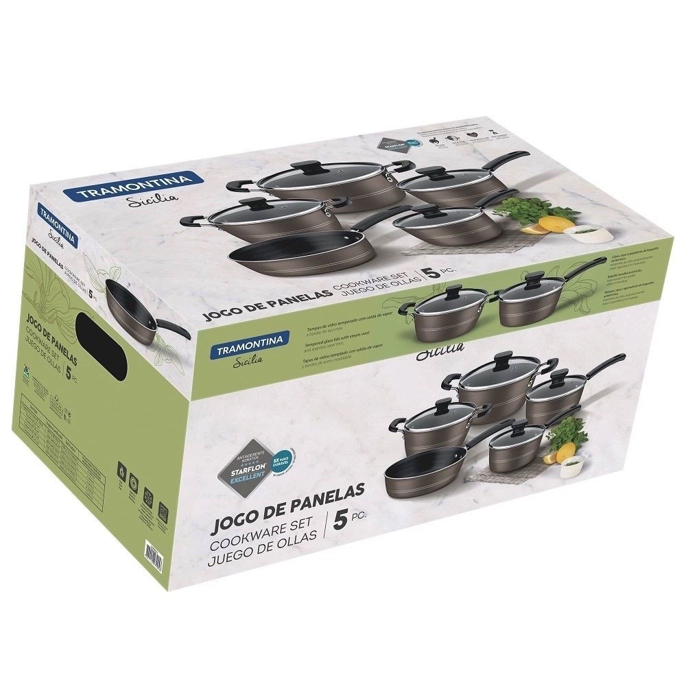 Jogo de Panelas Tramontina Sicília em Alumínio com Revestimento Interno e Externo Antiaderente Starflon Excellent 5 Peças O Jogo de Panelas Tramontina Sicília em Alumínio com Revestimento Interno e Externo Antiaderente Starflon Excellent 5 Peças é a escolha perfeita para quem deseja levar beleza e funcionalidade para sua cozinha. Produzidas em alumínio com revestimento interno em antiaderente Starflon Excellent, suas peças proporcionam um cozimento uniforme dos alimentos e evita que eles grudem em sua superfície, além de ser mais durável. Seus cabos, alças e pegadores são antitérmicos e proporciona um manuseio mais seguro e confortável. As panelas e caçarolas vem acompanhadas de uma tampa de vidro temperado com bordas em aço inox e saídas de vapor, que facilitam a visualização dos alimentos durante o preparo. Elas são ainda muito fáceis de limpar e podem ir à máquina de lavar louças, facilitando sua vida na cozinha! Caçarola Ø 20 cm 2,4 L Sicília C:31.6cm L:21.4cm A:14.4cm Caçarola Ø 24 cm 4,3 L Sicília C:37.7cm L:25.3cm A:16.8cm Panela Ø 16 cm 1,3 L Sicília C:33.3cm L:17.4cm A:12.6cm Panela Ø 18 cm 1,9 L Sicília C:35.3cm L:19.4cm A:13.5cm Frigideira Funda Ø 24 cm 2,5 L Sicília C:44cm L:25.2cm A:10.2cm Informações Gerais Corpo de alumínio com espessura que proporciona cozimento rápido e uniforme. Revestimento interno e externo de antiaderente Starflon Excellent que não gruda, é fácil de limpar, mais durável e não é prejudicial a saúde. Tampas de vidro temperado, com saída de vapor e bordas de aço inox. Cabos, alças e pegadores de baquelite antitérmicos que oferecem segurança durante o manuseio. Podem ir à máquina de lavar louças facilitando seu dia a dia. Recomendações de Uso A capacidade volumétrica máxima para cozimento é de 3/4 da capacidade total da peça. Posicione os cabos dos utensílios voltados ao centro do fogão. Em fogões com grade, centralize a peça e alinhe o cabo com a grade. Utensílios quentes devem estar fora do alcance das crianças. Este produto não pode sofrer modificações. Antes do primeiro uso, lave com esponja macia, sabão neutro ou detergente líquido. Depois de secar, unte a área interna com óleo ou gordura e leve ao fogo por um ou dois minutos. Deixe esfriar e lave novamente. Seu utensílio Starflon está pronto para uso com ou sem gordura, sempre em fogo baixo ou médio (nunca superior a 350ºC). Para mexer os alimentos use somente utensílios de silicone, nylon ou madeira. Evite a imersão do utensílio quente em água fria. Nunca utilize produtos abrasivos na lavagem. Se deixar queimar alimentos, umedeça a área e reserve até que possa remover os resíduos grudados com esponja e sabão. Para descarte dos produtos e embalagens siga as orientações de reciclagem vigentes. Este produto não necessita de manutenção, apenas limpeza. Peso 5,72 kg Garantia 90 dias para vícios ou defeitos de fabricação. Kit com 5 talheres em nylon para servir Lindo conjunto de utensílios em Nylon antiaderente, super resistente, suporta até 190ºC Contém: 1 Pegador de Massas 1 Concha 1 Espátula 1 Colher 1 Escumadeira Medidas Aprox. Comprimento 29cm Os Utensílios não são da marca Tramontina