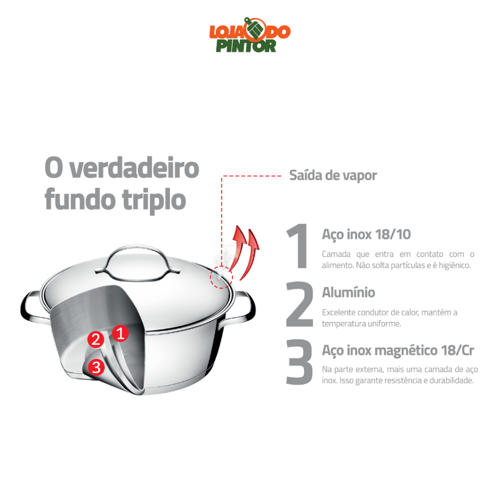 JOGO 3 PANELAS Caçarola funda Ø 16cm 1,50l Caçarola funda Ø 18cm 2,20l Caçarola funda Ø 20cm 3,10l O Jogo de Panelas Tramontina Allegra em Aço Inox com Fundo Triplo e Tampas de Inox 3 Peças vai tornar sua cozinha mais completa! Produzidas totalmente em aço inox, as três peças possuem fundo triplo (aço inox + alumínio + aço inox), característica que distribui o calor de forma uniforme, proporcionando um cozimento mais rápido e deixando os alimentos aquecidos por mais tempo, além de economizar mais energia. Estilosas, possuem acabamento em alto brilho que fazem delas protagonistas na hora de preparar e servir alimentos. Acompanham tampa com saída de vapor e encaixe perfeito. Muito fáceis de limpar, possuem desenho sem cantos que facilita a limpeza, além de poderem ser lavadas diariamente na máquina de lavar louças. São ainda panelas versáteis que pode ser utilizadas em diferentes tipos de fogões. Garanta o seu jogo e prepare as melhores receitas! USO A capacidade volumétrica máxima para cozimento é de 3/4 da capacidade total da peça. Antes de utilizar o produto, remover as eventuais etiquetas e lavar com água quente e detergente. Use uma fonte de calor brando para evitar que o alimento grude no fundo da panela. O fundo triplo distribui uniformemente o calor, não sendo necessário o fogo alto. E, além disso, você economiza energia. Quando a panela for utilizada no fogão a gás, a chama não deve ultrapassar a base da panela. No caso de uso de chapa elétrica, a chapa deverá ter diâmetro igual ou inferior ao da panela. Sempre dissolva o sal em água fervendo ou com os alimentos, mexendo os ingredientes no início do cozimento. Não aqueça o alimento colocando uma panela do mesmo diâmetro sobre a outra. Esse procedimento é perigoso, pois cria vácuo e impossibilita a retirada do mesma. Se a tampa da panela de aço inox Tramontina ficar presa pelo efeito do vácuo durante o resfriamento, basta puxar ou aquecer novamente até neutralizar o efeito do vácuo. O cabo de inox aquece durante o cozimento. Aconselhamos o uso de luvas durante o manuseio. Alguns alimentos que possuem amido, como massa e arroz, poderão deixar manchas na parte interna da panela durante o cozimento. Para remover facilmente as manchas, passe um pano umedecido com suco de limão ou vinagre, ou use a Pasta para Polir e Remover Manchas Tramontina. Evite deixar alimento na panela por muito tempo; o sal também pode provocar manchas. Para que a panela de aço inox fique sempre bonita e com brilho, recomendamos que seja lavada somente com detergente e esponja. A Tramontina desenvolveu uma pasta especial para polir e remover manchas nos produtos de aço inoxidável, que está disponível nos principais pontos de venda. Depois da lavagem, sempre que possível, enxágue a panela com água quente e seque-a imediatamente, para que ela mantenha o brilho original, pois o cloro e as substâncias contidas na água podem deixar manchas na panela. Pode ir ao forno em temperatura máxima de 260°C, podendo haver mudança na coloração. Não deixe a panela vazia sobre uma fonte de calor. Deixe panelas quentes somente em superfícies resistentes ao calor.