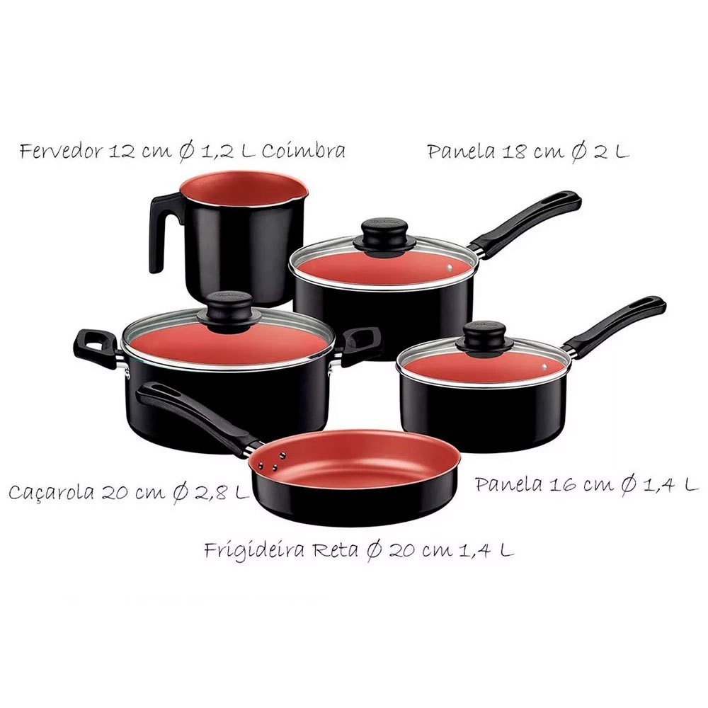 Jogo de Panelas Tramontina Caribe Revestimento Antiaderente Starflon Max 5 peças Complete sua cozinha com o jogo de panelas Tramontina Caribe com revestimento interno em antiaderente Starflon Max e externo de poliéster preto 05 peças. Ideal para preparar suas refeições diárias, ele tem peças produzidas em alumínio com espessura que proporciona o cozimento rápido e uniforme dos alimentos. Externamente elas são revestidas em poliéster e internamente em antiaderente Starflon Max, material que evita que os alimentos grudem em sua superfície. As panelas e a caçarola vem com tampas de vidro temperado com borda de aço inox que facilitam a visualização dos alimentos e facilitam o preparo. Os cabos, alças e pegadores são em materiais antitérmicos e oferecem maior segurança durante o manuseio! Composição 01 - Caçarola 20 cm 2,8 L 01 - Fervedor 12 cm 1,2 L Coimbra 01 - Frigideira Reta Ø 20 cm 1,4 L 01 - Panela 16 cm 1,4 L 01 - Panela 18 cm 2 L Corpo de alumínio com espessura que proporciona cozimento rápido e uniforme. Revestimento interno de antiaderente Starflon Max que não gruda, é fácil de limpar, mais durável e não é prejudicial à saúde, pois é livre de PFOA. Revestimento externo de poliéster. Tampas de vidro temperado com borda de aço inox. Cabos, alças de baquelite antitérmico e pegadores de nylon que oferecem segurança durante o manuseio. A capacidade volumétrica máxima para cozimento é de 3/4 da capacidade total da peça. Posicione os cabos dos utensílios voltados ao centro do fogão. Em fogões com grade, centralize as peças sobre a chama ou fonte de calor e alinhe os cabos com a grade. Utensílios quentes devem estar fora do alcance das crianças. Para descarte dos produtos e embalagem siga as orientações de reciclagem vigentes. Garantia 90 dias para vícios ou defeitos de fabricação. Marca: Tramontina Linha: Caribe Peso: 3.12 kg