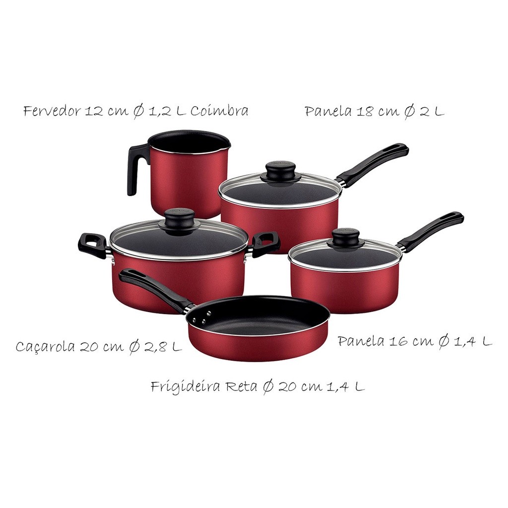 Jogo de Panelas Tramontina Caribe 5 peças Vermelho e Conjunto de Utensílios 5 Pçs