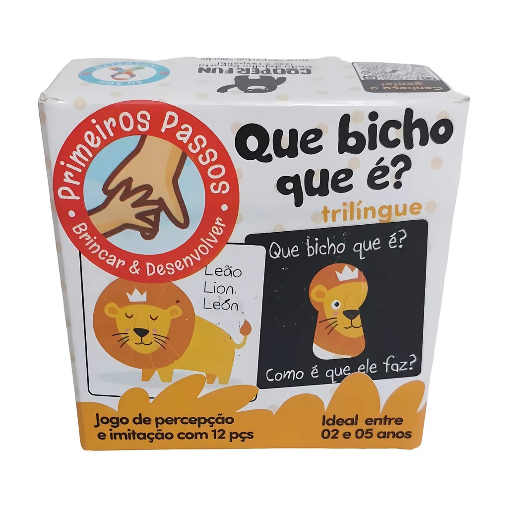 Esse é um daqueles jogos que além de garantir a diversão garante também o aprendizado! O jogo de Associação Que Bicho Que É? interativo é super divertido e colorido, são 12 cartas todas com uma linda ilustração.Objetivo do jogo além de promover diversão, e desenvolver o raciocínio lógico das crianças e sua percepção visual, o conhecimento das cores e formas. Estimula a percepção, o movimento e memória da criança, que aprende os termos em 3 línguas!Diversão: 100%. Custo x Benefício: 200% Um jogo de ótima qualidade e todas as suas peças são fáceis de destacar, garantindo muita diversão. Você pode jogar memória, você pode usar as cartas para contar uma história, ou você pode fazer as 2 coisas ao mesmo tempo! Com 1 ano, as ilustrações oferecem texturas, traços mais detalhados e uma expressão ou onomatopéia. Os cartões podem ser usados como roteiro para uma história. Desenvolve: - Percepção Visual - Percepção Auditiva - Conhecimento Específico - Atenção e Foco - Coordenação Motora A partir de 1 ano de idade, a criança já está com a visão muito próxima da nossa, percebendo detalhes como profundidade e associação dos sons. Especificações: - Idade:2+ anos - Dimensão: 3,0 x 8,0 x 8,0 cm - Peso:0.11kg Características: - Marca: COOPER FUN - Modelo: 00153 *Imagens Meramente Ilustrativas* Conteúdo da Embalagem: - 01 Jogo de associação c/ 12 Cartas (Todas Ilustradas). jogo de associação - cooper fun - jogos educativos - jogo educativo - jogo de percepção