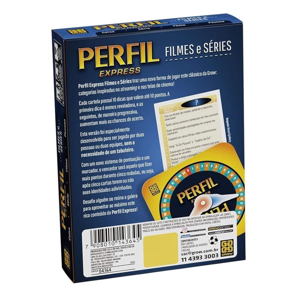 Perfil Express Filmes e Séries traz uma nova forma de jogar este clássico da Grow: categorias inspiradas no streaming e nas telas de cinema! O Jogo vem com 100 cartas tematizadas com filmes e séries, cada carta possui 10 dicas que valem até 10 pontos. A primeira dica é menos reveladora, e as seguintes, de maneira progressiva, aumentam mais as chances de acerto. Esta versão foi especialmente desenvolvida para ser jogada por duas pessoas ou duas equipes, sem a necessidade de um tabuleiro. Com um novo sistema de pontuação em um marcador, o vencedor será aquele que fizer mais pontos durante cinco rodadas, ou seja, após cinco cartas terem ou não suas identidades adivinhadas. Desafie alguém ou reúna o pessoal para aproveitar o máximo este rico conteúdo do Perfil Express! - Caixa pequena versão pocket, carregue seu Perfil Express para onde quiser!! - Tamanho da caixa (medidas aproximadas): 11,4 x 16 x 3,6 cm - 100 cartas tematizadas Filmes e Séries com 10 dicas cada - Faixa Etária : A partir de 12 anos - Participantes: 2 ou mais - Outras Informações: Não recomendável para menores de 3 anos por conter partes pequenas Características: - Marca: Grow - Modelo: 04364 *Imagens Meramente Ilustrativas* Conteúdo da Embalagem: - Contém 100 cartas, 1 marcador de pontos e 1 regra jogo perfil express - jogo de cartas perfil express - jogo perfil express filmes e series - jogo de perguntas e respostas - jogo de perguntas e respostas filmes e series - jogo de perguntas da grow
