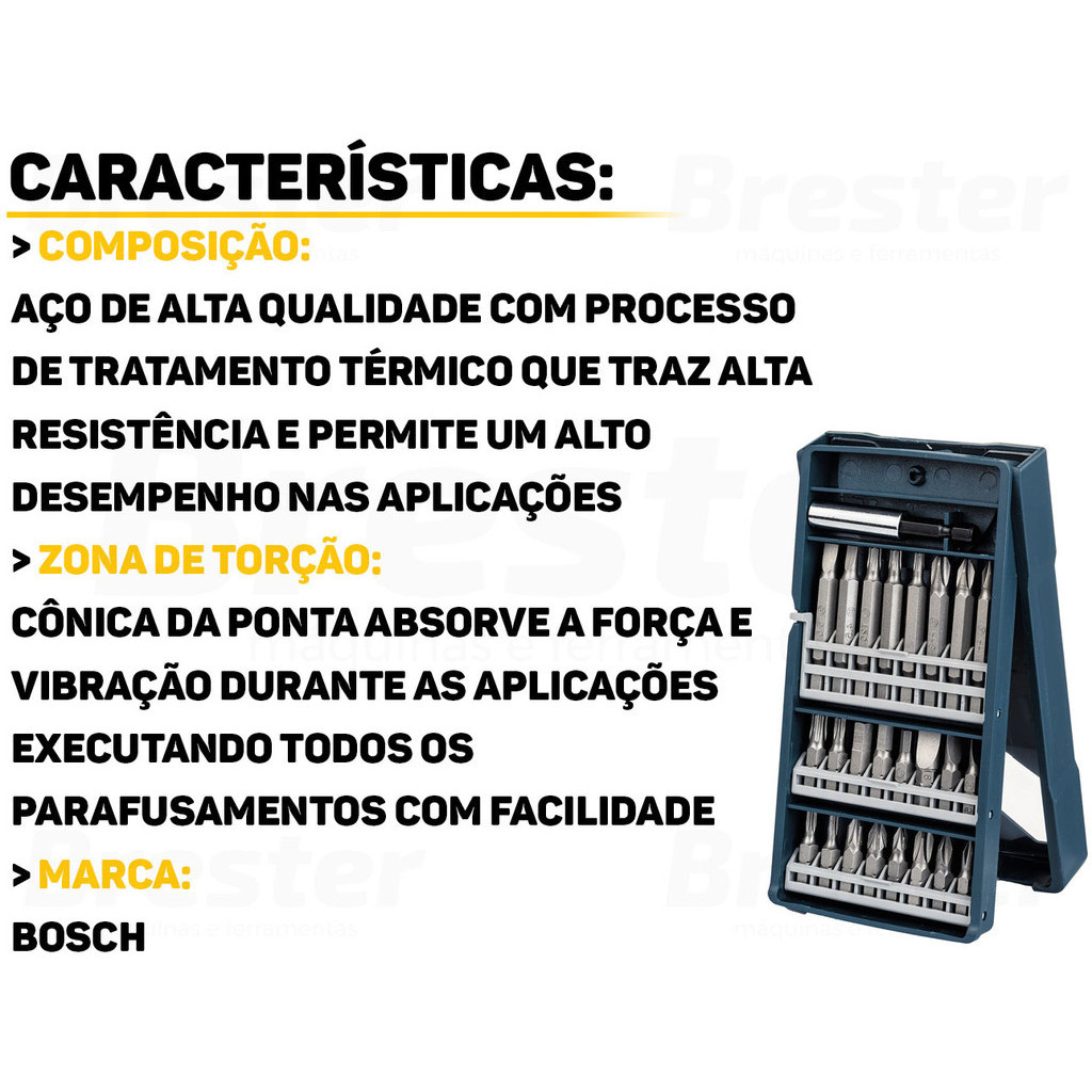 Olá, Bem vindo a Distribuidora Brester. Trabalhamos com uma grande variedade de ferramentas elétricas e manuais, descartáveis, eletroeletrônicos, artigos para casa, artigos de petshop e outros. Aqui você encontrará Produtos Originais, Nota Fiscal, Pronta Entrega e Envio Imediato! Informações do Produto: Mini XLine Com 25 Pontas Para Parafusar Bosch Apresentamos o Mini XLine Bosch, o conjunto de 25 Pontas Para Parafusar que vai transformar sua experiência na hora de apertar e soltar parafusos! Tenha todas as pontas que você precisa em um único conjunto, organizado e pronto para usar. Diga adeus à frustração de não encontrar a ferramenta certa na hora certa! Características: > Possui estojo para armazenar e organizar as brocas; > A zona de torção cônica suporta facilmente os torques máximos, cumprindo todas as tarefas; > Produzido em aço de alta qualidade com processo de tratamento térmico que traz alta resistência e permite um alto desempenho nas aplicações. Especificações Técnicas: > Material: aço; > O kit acompanha: - 16 Bits de 25mm: - Phillips: PH 1/2/3; - Pozidrive: PZ 1/2/3; - Fenda simples SL 4,5/5,5/8,0; - Hexagonal HEX 4/5/6; - Tork T15/20/25/30; - 8 Bits de 50mm; - Phillips PH 1/2/3; - Fenda simples SL 4,5/5,5; - Tork T15/20/25; - 1 suporte universal magnético. - Marca: Bosch - Garantia: 12 meses contra defeitos de fabricação Vantagens de comprar na Brester: - Nota fiscal para Pessoa Física e Pessoa Jurídica; - Produto novo, com garantia de fábrica; - Produto a pronta entrega; - Envio em até 24hs em dias úteis após confirmação do pagamento. Obrigado por escolher a Brester Máquinas.