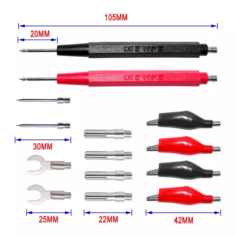 Jogo de pontas de prova universal para multímetros com acessórios intercambiáveis. Os cabos possuem terminais rosqueáveis que permitem trocar facilmente os vários tipos de ponteiras em qualquer combinação, de acordo com sua necessidade. Acompanham plugues banana de 4mm padrão compatível com praticamente qualquer multímetro de qualquer fabricante. Os terminais forquilha tem abertura de 6mm e podem ser conectados, por exemplo, nos bornes de fontes de alimentação de bancada. * Especificações: - Modelo: VTi-13 - Corrente máxima: 10A - Tensão de isolação: 1000V - Comprimento do cabo: 940 mm - Tamanho das ponteiras: 22x2 mm (CxD) - Tamanho da garra jacaré: 35x3,5 mm (CxL) - Abertura máxima das garrinhas jacaré: 10 mm - Comprimento dos pinos banana: 18 mm - Tamanho dos terminais forquilha: 12x6 mm - Rosca dos terminais: M4 * Itens inclusos: - 01 Cabo cor vermelha - 01 Cabo cor preta - 01 Ponteira cor vermelha - 01 Ponteira cor preta - 04 Garras tipo jacaré (2 vermelhas e 2 pretas) - 04 Pinos banana 4 mm - 02 Pontas tipo agulha de 2mm - 02 Terminais forquilha