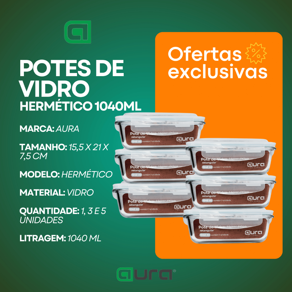 Potes de Vidro Herméticos Retangulares 1040ml – Alta Resistência e Vedação Perfeita Tenha mais praticidade, segurança e organização no armazenamento dos seus alimentos com este kit de 10 potes herméticos de vidro com tampa. Eles preservam o sabor, evitam odores indesejados e garantem uma vedação perfeita, sem vazamentos. Principais Vantagens: Alta Resistência: Suporta variação de temperatura até 300ºC Versatilidade: Pode ser usado no micro-ondas, forno (sem tampa), geladeira e freezer Vedação Hermética: Tampa com anel de silicone removível que evita vazamentos e mantém os alimentos frescos por mais tempo Fácil de Limpar: Componentes removíveis para uma higienização completa Especificações Técnicas: Modelo: Pote de Vidro Hermético Retangular Capacidade: 1040ml Dimensões Aproximadas: 15,5 x 21 x 7,5 cm (L x C x A) Material: Vidro com tampa plástica e vedação de silicone Peso Unitário: 480g Cores das Tampas: Sortidas Conteúdo da Embalagem: 1, 2 e 5 Potes de Vidro Hermético Retangulares com Tampas Ideal para quem busca qualidade, durabilidade e praticidade no dia a dia, seja para levar refeições ao trabalho ou organizar alimentos na geladeira e no freezer.