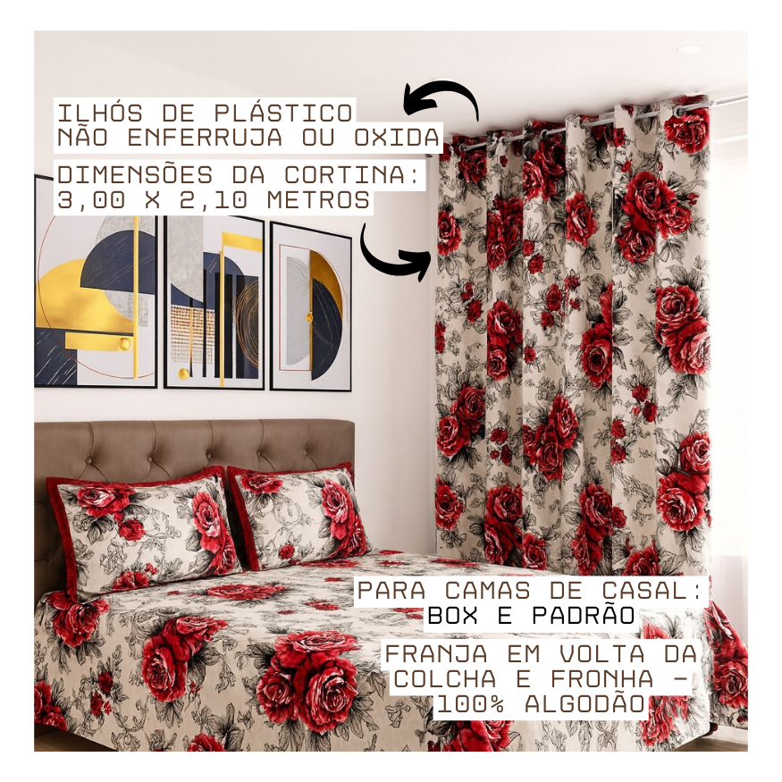 Nosso Jogo de Quarto c/ Colcha e Cortina de Linhão é perfeito para decorar sua casa com muito estilo. Feito com 75% algodão e 25% poliéster, é adequado para máquina de lavar roupa, facilitando a limpeza e manutenção. Com 2,20m de comprimento e 2,40m de largura, é ideal para colchão de Casal Box ou Padrão. O modelo de colcha de Linhão com franja e cortina traz um toque de elegância para o ambiente. As diversas estampas disponíveis garantem que você encontre a combinação perfeita para o seu ambiente. O QUE IRÁ RECEBER: 1x - Colcha de Linhão Queen Casal Box - 2,20m x 2,40m 1x - Cortina de Linhão – 3,00m x 2,10m 2x - Porta Travesseiro de Linhão - 50cm x 70cm **ESPECIFICAÇÕES** Composição do Tecido: LINHÃO (Tecido Maquinetado) 75% Algodão 25% Poliéster **BENEFÍCIOS** - Ideal para deixar seu quarto mais moderno e sofisticado; - Tecido de qualidade; - Possui Franja na Fronha; - Acabamento da colcha c/ Franja; - Combinação ideal entre conforto e elegância; - Costura reforçada; Para escolher Cores ou Estampas e quantidades diferentes siga esse passo a passo: 1. Escolha a quantidade que deseja para a cor que deseja, clique em "Adicionar ao carrinho" 2. Após isso na tela do navegador existe um botão que é um símbolo de voltar, clique nesse botão, escolha a segunda cor e a quantidade. 3. Caso queira finalizar a compra basta clicar em finalizar a compra ou clicar no Ícone do carrinho no canto superior direito e finalizar a compra. AVISO: O pedido é enviado conforme a compra, se atente e escolha com calma a cor/estampa desejada antes de finalizar a compra. Postamos em até 24 horas; Compra garantida; Qualidade comprovada pelas avalições do produto Ficou com dúvidas? Envie sua mensagem no campo de perguntas abaixo, no rodapé do anúncio! TUDO PARA CAMA MESA E BANHO: TOALHA DE MESA TOLHA DE BANHO TOALHA DE ROSTO TRAVESSEIRO ROUPÃO TAPETES LENÇOL COLCHA COBRE LEITO FRONHA PERCAL 180 FIOS 120 FIOS 150 FIOS 200 FIOS 300 FIOS ENXOVAL PRESENTES CASAMENTO COZINHA QUARTO SALA BANHEIRO CASA HOME HOTEL, LINHÃO, COBRE LEITO COLCHA