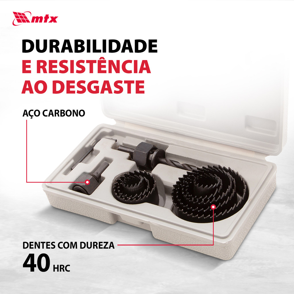 Conjunto de Serragens Copo MTX 704739 - Alta Performance, Precisão e Durabilidade para Projetos de Reforma e Construção O Conjunto de Serragens Copo MTX 704739 é a escolha perfeita para quem busca eficiência, precisão e durabilidade em cortes circulares. Ideal para madeira, MDF, drywall, plástico e laminado, este conjunto contém 11 peças que atendem a uma variedade de necessidades, com coroas de 19 a 64 mm. Com mandris grandes e pequenos, você pode facilmente instalar as serras copo em qualquer furadeira elétrica, garantindo furos limpos e precisos para aplicações como tomadas, interruptores, luminárias e tubos. Desempenho Imbatível: Feitas em aço carbono resistente, as serras copo são projetadas para resistir ao desgaste, mantendo suas bordas de corte com dureza de 40 HRC por muito mais tempo. O design dos dentes afastados nas coroas proporciona uma remoção rápida de cavacos, o que não apenas aumenta a velocidade de perfuração, mas também reduz o tempo de trabalho e melhora a eficiência geral. Precisão e Facilidade no Corte: A broca centralizadora permite posicionar as serras copo com exatidão, garantindo furos uniformes e sem desvios. Isso torna o trabalho mais rápido e profissional, especialmente para tarefas de alta precisão. Além disso, as serras copo são facilmente fixadas no mandril com uma chave hexagonal de 2,5 mm, o que proporciona segurança e estabilidade durante o corte. Praticidade e Organização: O conjunto vem em uma caixa plástica compacta e resistente, com compartimentos bem organizados para armazenamento e transporte prático. Isso garante que suas ferramentas fiquem sempre organizadas e protegidas, além de facilitar o acesso rápido durante o uso. Com o Conjunto de Serragens Copo MTX 704739, você terá uma solução completa para cortar furos circulares em diversos materiais com desempenho superior, alta durabilidade e precisão profissional. Perfeito para quem busca agilidade em reformas, construções ou projetos domésticos, esse conjunto é indispensável para um trabalho eficiente e sem erros.