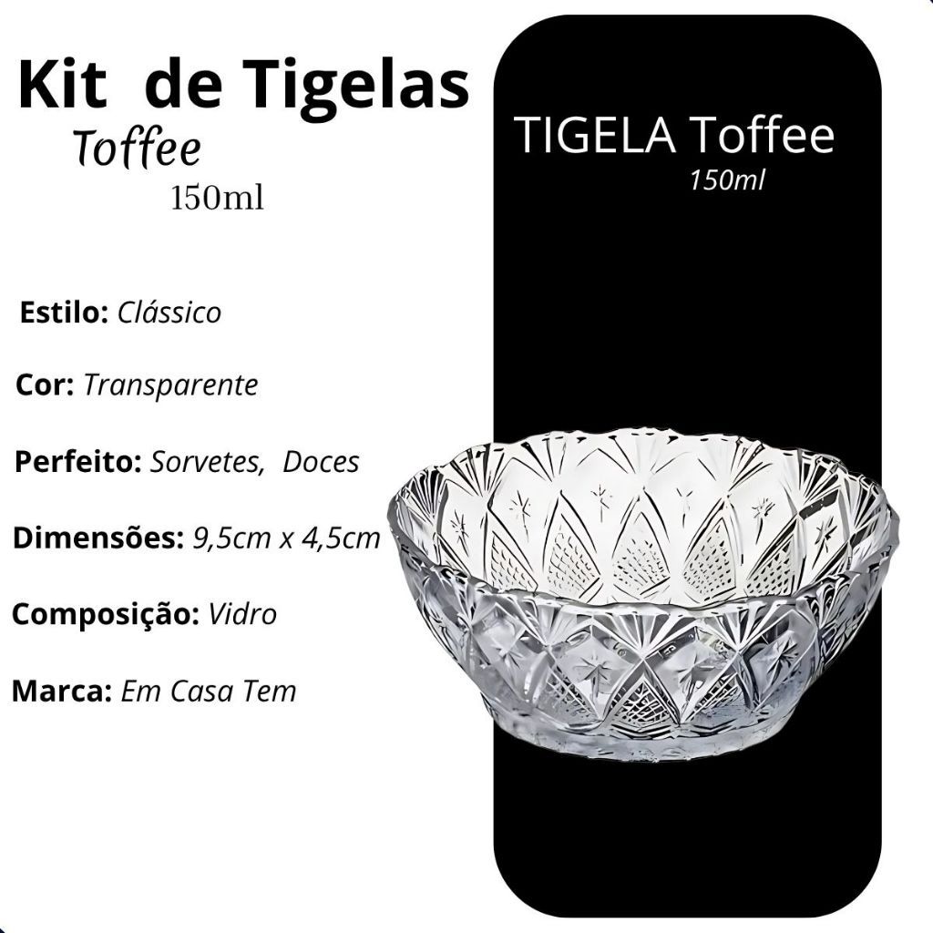 TIGELA TOFFEE 150ML – VIDRO REFORÇADO, DELICADO PARA MESA POSTA Transforme a forma de servir à mesa com o Conjunto de Tigelas de Vidro 150ml. Cada tigela possui acabamento texturizado que adiciona elegância e profundidade visual, tornando o momento de servir ainda mais especial. Com capacidade de 150ml, são ideais para servir sobremesas, frutas, petiscos, entradas, molhos, porções de saladas e até acompanhamentos. Feitas em vidro 100% transparente e com acabamento refinado, essas tigelas combinam perfeitamente com qualquer estilo de mesa posta. KIT COM 12 TIGELAS DE VIDRO – Ideal para servir sobremesas, frutas, molhos, petiscos e porções pequenas. DESIGN ELEGANTE COM TEXTURA TRABALHADA – Sofisticação para qualquer ocasião, do jantar formal ao dia a dia. VIDRO TRANSPARENTE DE QUALIDADE – Resistente, durável e com excelente acabamento. CAPACIDADE DE 150ML – Tamanho prático para servir bem com charme e organização. VERSÁTIL E FUNCIONAL – Perfeito para festas, reuniões, cafés, almoços e jantares especiais. Uma escolha prática e charmosa para quem busca funcionalidade, beleza e durabilidade na rotina ou em ocasiões especiais. RECOMENDAÇÕES DE USO E OCASIÕES: Ideal para servir brigadeiro de colher, mousses, frutas picadas, queijos, castanhas, molhos e acompanhamentos; Perfeito para almoços, jantares, cafés da tarde, eventos, festas ou como item decorativo para mesa posta; Excelente opção para uso doméstico, restaurantes, buffets, padarias e eventos corporativos. CUIDADOS COM O PRODUTO: Lavar com esponja macia e detergente neutro; Para limpeza profunda, deixar de molho em água morna com detergente; Não utilizar palha de aço, produtos abrasivos ou objetos pontiagudos; Evitar quedas e impactos mecânicos; Manter fora do alcance de crianças. ATENÇÃO: O uso incorreto poderá reduzir a vida útil do produto. INFORMAÇÕES TÉCNICAS DO PRODUTO: Conteúdo: Conjunto de Tigelas Sobremesa,Petisqueiras Kit contém: 3 peças - 6 Peças - 12 Peças - 24 Peças (Escolher na Variação) Capacidade: 150ml (cada unidade) Dimensões aproximadas (cada tigela): Altura: 4,5cm Diâmetro: 9,5cm Espessura: 3mm Composição: 100% vidro Validade: Indeterminada Categoria: Utilidades domésticas – Tigelas para sobremesa Embalagem: Caixa própria com proteção para transporte Imagens Meramente Ilustrativas