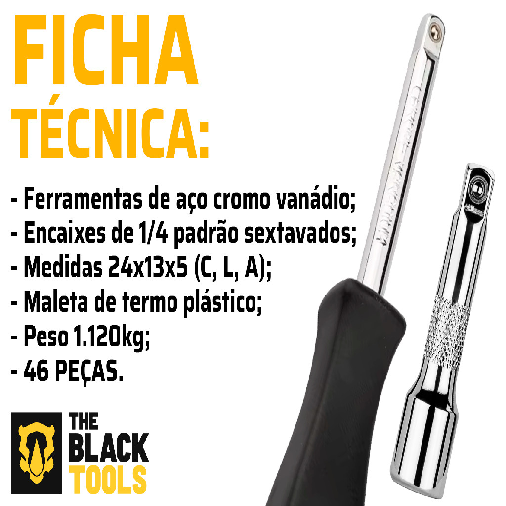 Jogo De Soquete Aço Crv 1/4 Catraca Chave Allen Kit Ferramentas C/ Maleta 46 Peças The Black Tools