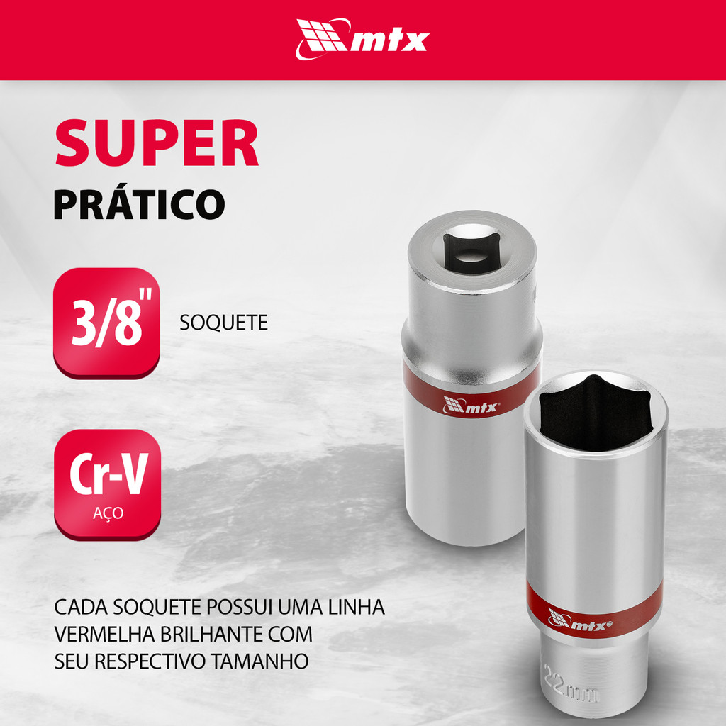 JOGO DE SOQUETE SEXTAVADO LONGO ENCAIXE 3/8POL., CROMO VANADIO, 8-19MM, 10PCS // MTX