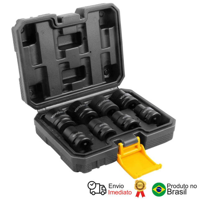 Jogo de soquetes de impacto sextavados, encaixe de 1/2", 10,0 mm a 24,0 mm, com 8 peças, VONDER Produzido em aço cromo molibdênio, que confere maior resistência e durabilidade, e acabamento fosfatizado, proporcionando maior resistência à oxidação/corrosão. Indicado para apertar e soltar porcas e parafusos sextavados. Utilizado em chaves de impacto pneumáticas e elétricas. Especificações Técnicas: Material do jogo de soquete: Aço cromo molibdênio Encaixe: 1/2" Número de peças do jogo de soquete: 8 peças Capacidade: 10 mm a 24 mm Massa aproximada (peso) (kg): 1,0 kg Conteúdo Da Embalagem: 1 Jogo de soquetes composto por 8 peças, sendo: soquetes sextavado 1/2" (10,0 mm, 12,0 mm, 13,0 mm, 14,0 mm, 17,0 mm, 19,0 mm, 21,0 mm, 24,0 mm). Acompanha maleta plástica.